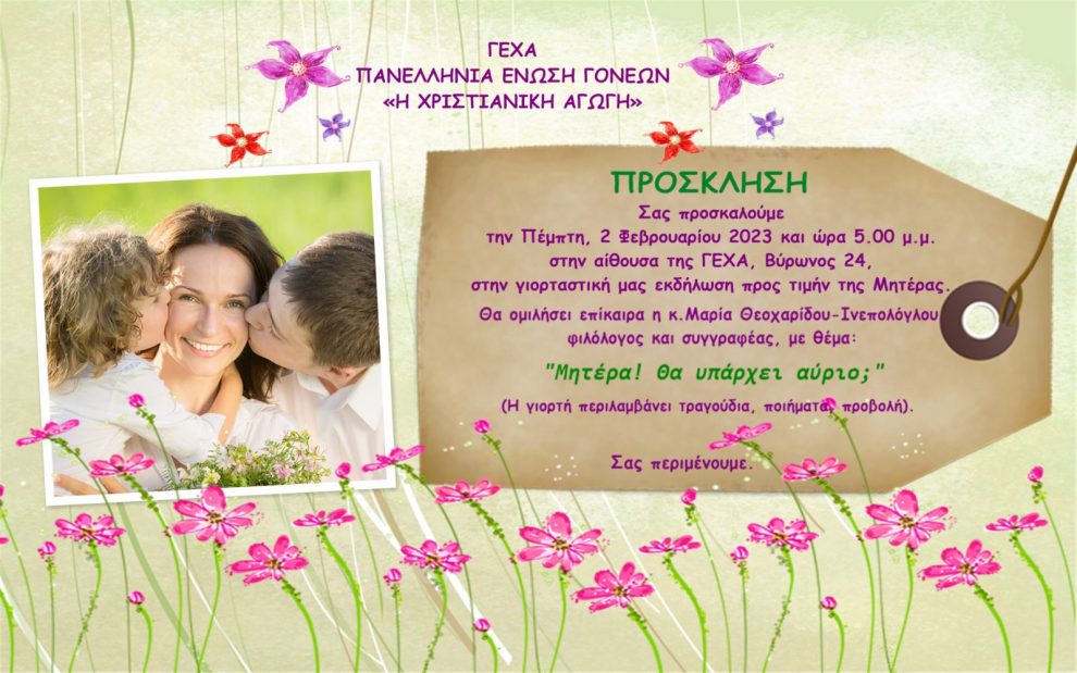 Σας προσκαλούμε την Πέμπτη 2 Φεβρουαρίου 2023 και ώρα 5:00 μ.μ. στην αίθουσα της Γ.Ε.Χ.Α., Βύρωνος 24, στη γιορταστική μας εκδήλωση προς τιμήν της Μητέρας. Θα ομιλήσει επίκαιρα η κ. Μαρία Θεοχαρίδου-Ινεπολόγλου, φιλόλογος και συγγραφέας, με θέμα: