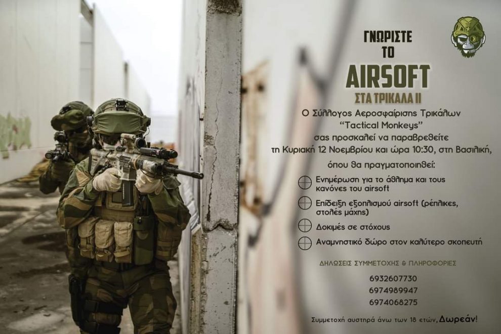 Αν είστε λάτρεις των outdoor extreme sports; Ελάτε μαζί μας να γνωρίσετε τον κόσμο του Airsoft και να ζήσετε μια συναρπαστική εμπειρία διασκέδασης! Το Airsoft είναι ένα σύγχρονο αγώνισμα που προσομοιώνει συνθήκες μάχης σε ελεγχόμενο και ασφαλή περιβάλλον. Ελάτε να παίξετε με τους φίλους σας και νιώστε την αδρεναλίνη σας, να ανεβαίνει στα ύψη! Η ομάδα Αεροσφαίρισης Tactical Monkeys Trikala A.C. σας προσκαλεί να παραβρεθείτε την Κυριακή 12 Νοεμβρίου και ώρα 10:30 το πρωί, στη Βασιλική Τρικάλων όπου θα πραγματοποιηθεί:
