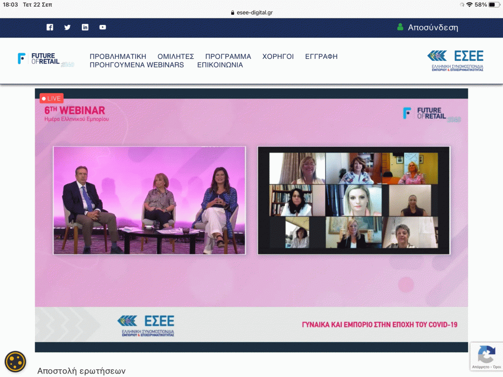 Η ΕΣΕΕ διοργάνωσε το μεσημέρι της Τετάρτης το 6ο Webinar με θέμα “Γυναίκα και Εμπόριο στην εποχή του Covid-19”, μιας και αφιερώνει φέτος, την Ημέρα Ελληνικού Εμπορίου, που έχει θεσπιστεί να εορτάζεται στις 22 Σεπτεμβρίου, στη Γυναίκα Επιχειρηματία.