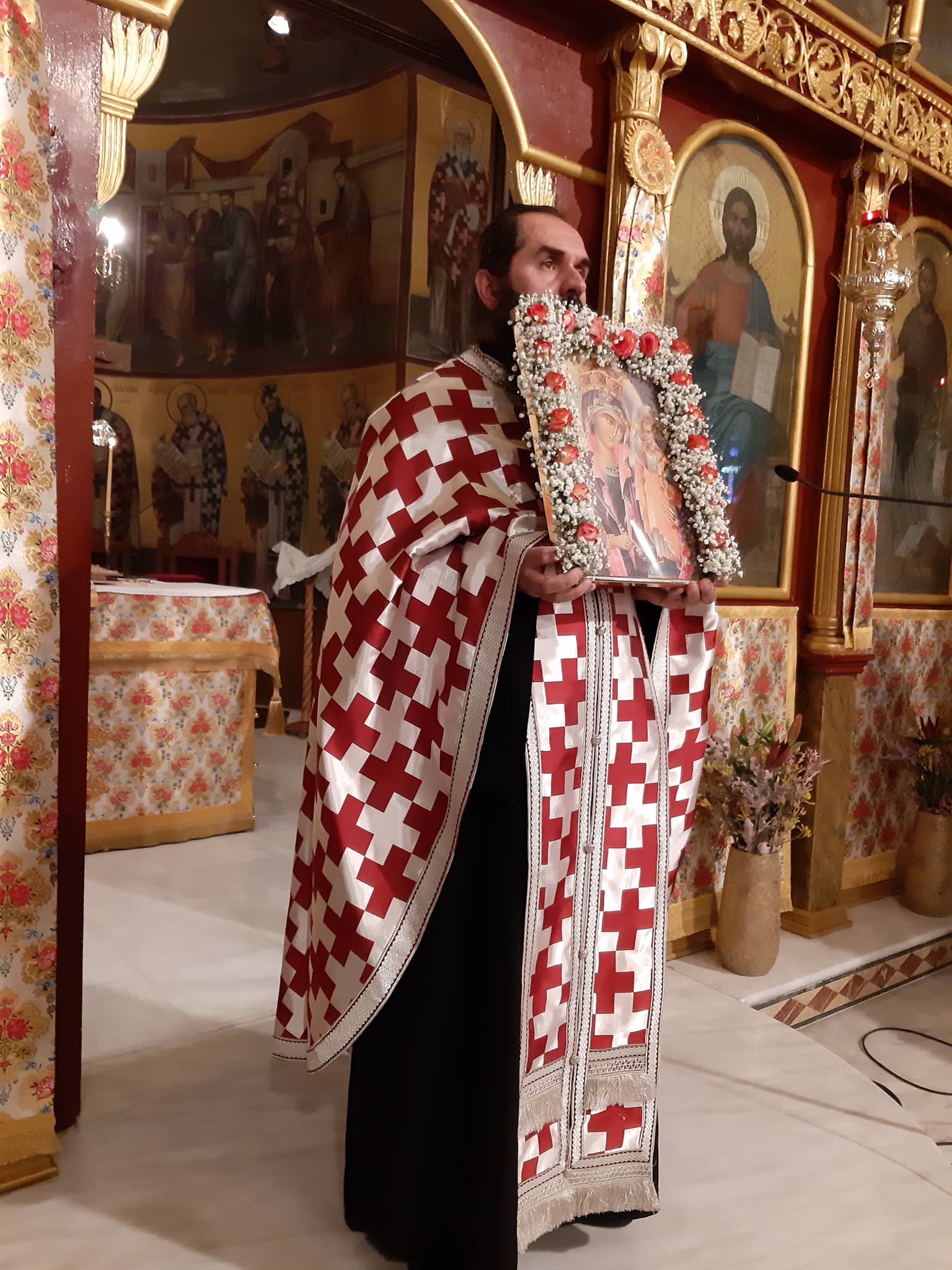 Σε κλίμα συγκίνησης γιατί την υποδέχθηκε στη νέα του Ενορία ο εφημέριος του Ναού π. Νικόλαος Δαλαγιώργος ο οποίος και την εμπνεύστηκε και φιλοτέχνησε. Η υποδοχή έγινε στα προπύλαια του Ναού υπό του Μητροπολίτου Τρίκκης, Γαρδικίου και Πύλης Χρυσοστόμου, συμμετοχή κλήρου και λαού. Ακολούθως τελέστηκε πανηγυρικός Αρχιερατικός Εσπερινός. Όπως μας εξηγεί ο π. Νικόλαος Δαλαγιώργος “Ονομάστηκε «Βασίλισσα» Βασίλισσα δηλαδή του ουρανού και της γης, πάντων των ανθρώπων, η οποία αναφέρεται στην κατάσταση της Παναγίας μας μετά τον θάνατό της. Η Κυρία Θεοτόκος, μετά την Κοίμηση και την Μετάστασή της στους ουρανούς δέχεται τιμές μοναδικές απὸ τον Κύριο καὶ Θεό Της, Ιησού Χριστό. Την στέφει Βασίλισσα τῶν Οὐρανῶν καὶ τὶς ἀποδίδει θρόνο υψηλὸ στα δεξιά Της. Αναφέρεται χαρακτηριστικὰ από τον άγιο Ιωάννη