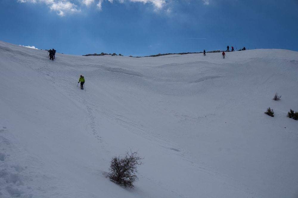 Φτάνοντας στο οροπέδιο, δεξιά μας προβάλλει η στρόγγυλη κορυφή Μπέλου, τριακόσια μέτρα ψηλότερα και αριστερά βρίσκεται η Ολύτσικα, αόρατη από εδώ. Εμείς κινούμαστε αριστερά, προτιμώντας το παγωμένο πεδίο έστω και αν γνωρίζουμε ότι η κορυφή είναι μακριά και η ώρα περασμένη. Προσαρμόζοντας τα κραμπόν στα άρβυλά μας, η ανάβαση γίνεται μια απολαυστική άσκηση.