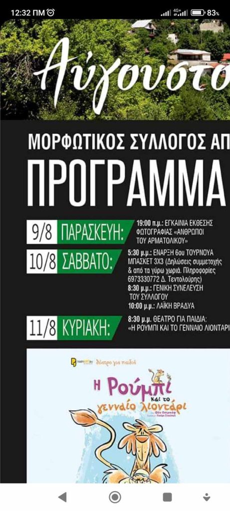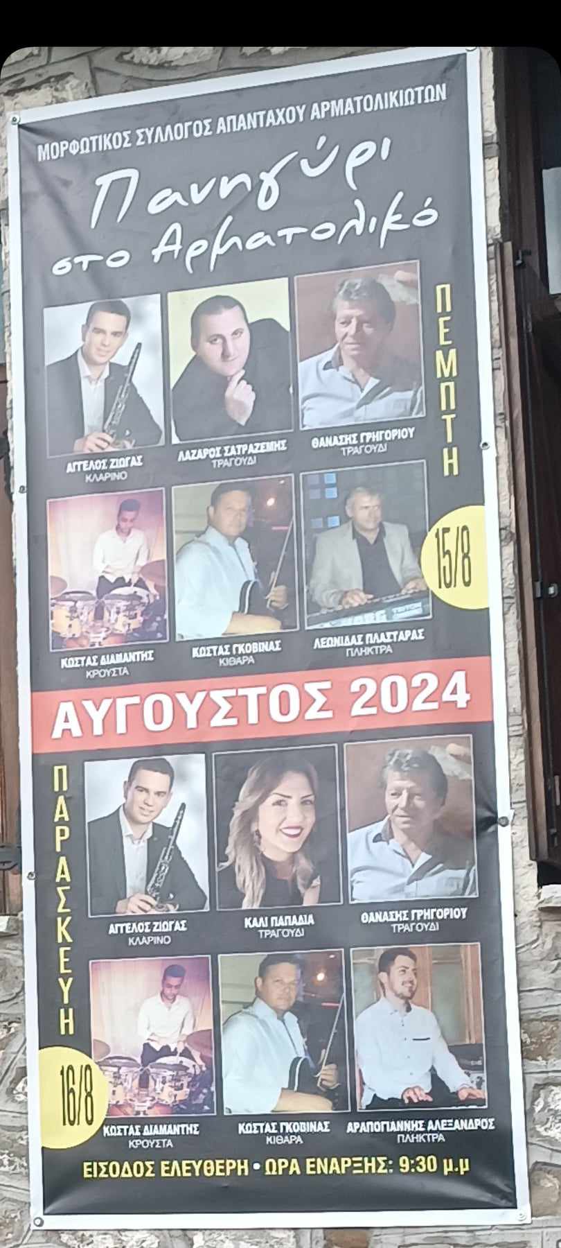 Ο Μορφωτικός Σύλλογος Απανταχού Αρματολικιοτών, όπως κάθε χρόνο, έτσι και φέτος τις ημέρες του δεκαπενταύγουστου διοργανώνει μια σειρά από πλούσιες, πολιτιστικές, και αθλητικές εκδηλώσεις. Δεν θα λείπει βέβαια και η διασκέδαση με λαική βραδιά το Σάββατο 10 Αυγούστου, και δημοτικές βραδιές, την Πέμπτη και την Παρασκευή 15 και16 αυγούστου αντίστοιχα, όταν και θα χορέψουμε όλοι μαζί τα παραδοσιακά “κάγκελα”.
