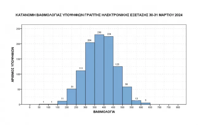 Στο συνημμένο γράφημα του proson.gr παρακάτω εμφανίζεται η συνολική επίδοση των 1.034 υποψηφίων που έλαβαν μέρος στη γραπτή εξέταση. Η μέγιστη επίδοση βαθμολογίας είναι 635,77 μονάδες και η ελάχιστη επίδοση 85,33 μονάδες.
