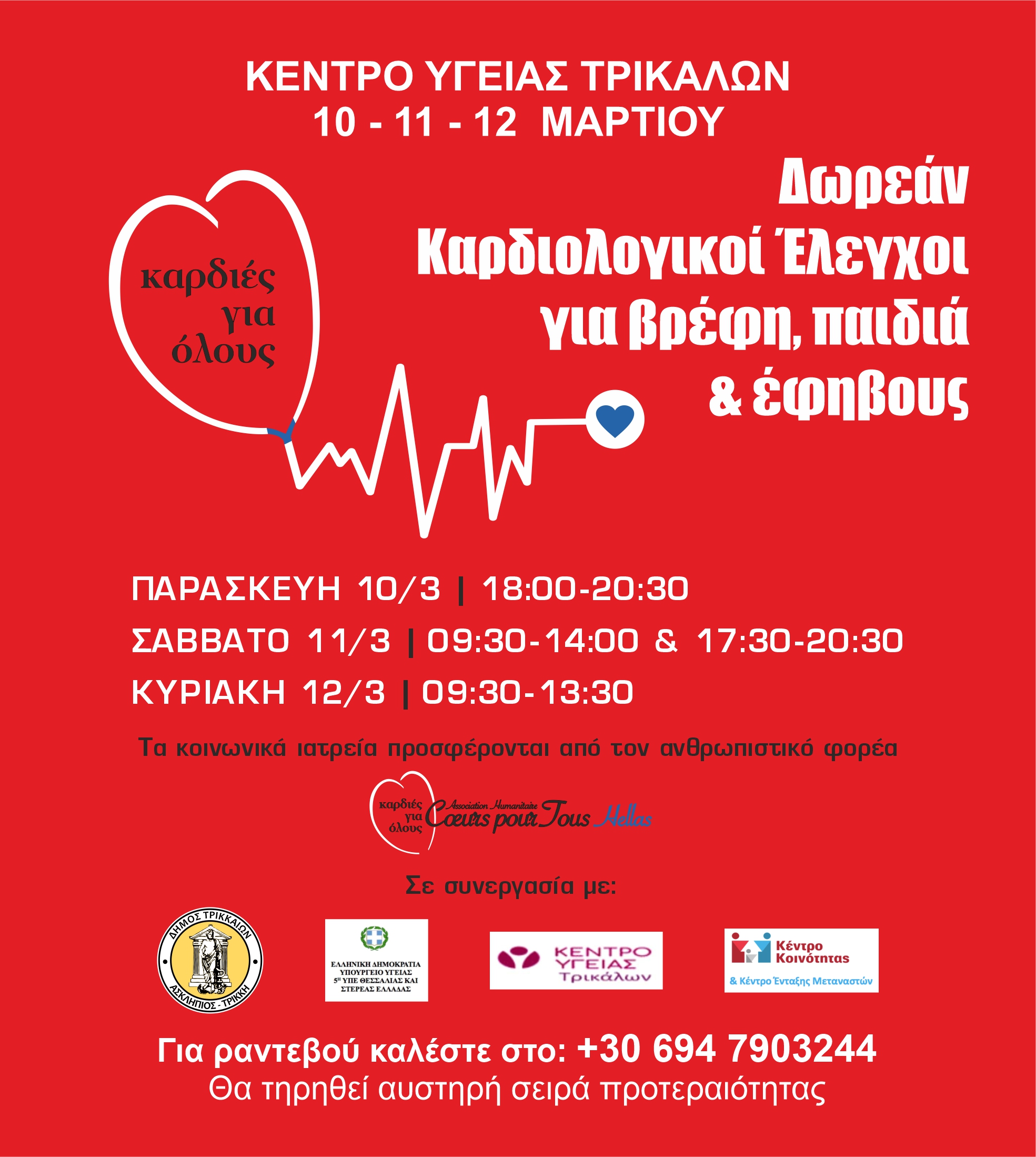 Μια ακόμη σημαντική δράση για την υγεία προωθεί και στηρίζει ο Δήμος Τρικκαίων με τον ανθρωπιστικό φορέα «Καρδιές για Όλους». Πρόκειται για δωρεάν καρδιολογικούς ελέγχους σε παιδιά από νεογνική έως και εφηβική ηλικία, με την πολύτιμη στήριξη της 5ης ΥΠΕ και του κέντρου Υγείας Τρικάλων.
