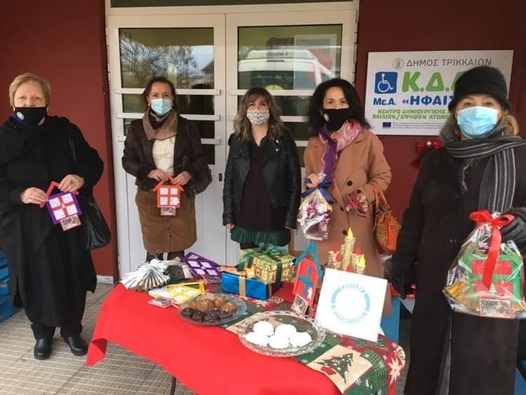 Προσφορά χαράς από κλιμάκιο του Ροταριανού Ομίλου Τρικάλων στους/τις φιλοξενούμενους/ες του ΚΔΑΠ ΜΕΑ «ΗΦΑΙΣΤΟΣ» του Δήμου Τρικκαίων. Με μια ζεστή αγκαλιά και περισσό χαμόγελο, η πρόεδρος του Ροταριανού Ομίλου Τρικάλων Τέση Αποστολίδου με κλιμάκιο του Ομίλου επισκέφθηκαν το ΚΔΑΠ, στην προσπάθεια να ενισχυθεί το χριστουγεννιάτικο κλίμα. Τα μέλη του κλιμακίου υποδέχθηκε η αντιδήμαρχος Κοινωνικής Μέριμνας Γεωργία Κοτρώνη – Μπαλοδήμου, που ευχαρίστησε τις εκπροσώπους του Ομίλου για την πρωτοβουλία και την προσφορά τους. Τα δώρα ήταν ευγενική χορηγία της «Ενωσης Εικαστικών Λάνασσα υπέρ φορέων καρκινοπαθών».