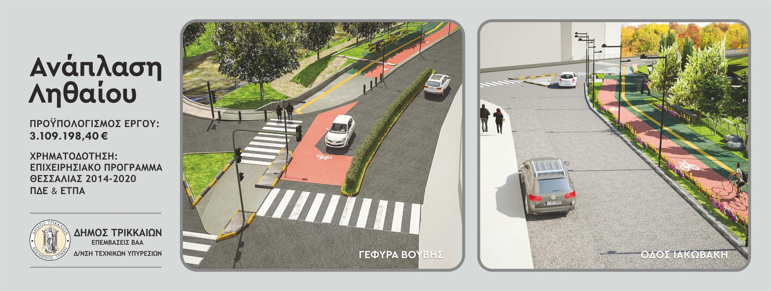 Με το έργο «Ανάπλαση Παρόχθιας Ζώνης Ληθαίου Ποταμού κατά μήκος της κοίτης εντός του σχεδίου πόλης» αναμορφώνονται πλήρως οι όχθες του ποταμού σε ένα μήκος 2,5 χλμ. (από τη γέφυρα Γκίκα και το Μουσείο Τσιτσάνη μέχρι την οδό Καλαμπάκας).