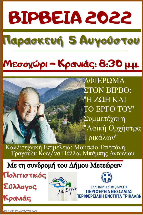 Η εκδήλωση έχει τον τίτλο «ΒΙΡΒΕΙΑ 2022: Κώστας Βίρβος – Η ζωή και το έργο του» και τελεί υπό την αιγίδα της Περιφέρειας Θεσσαλίας, Περιφερειακής Ενότητας Τρικάλων και τη συνδρομή του Δήμου Μετεώρων.