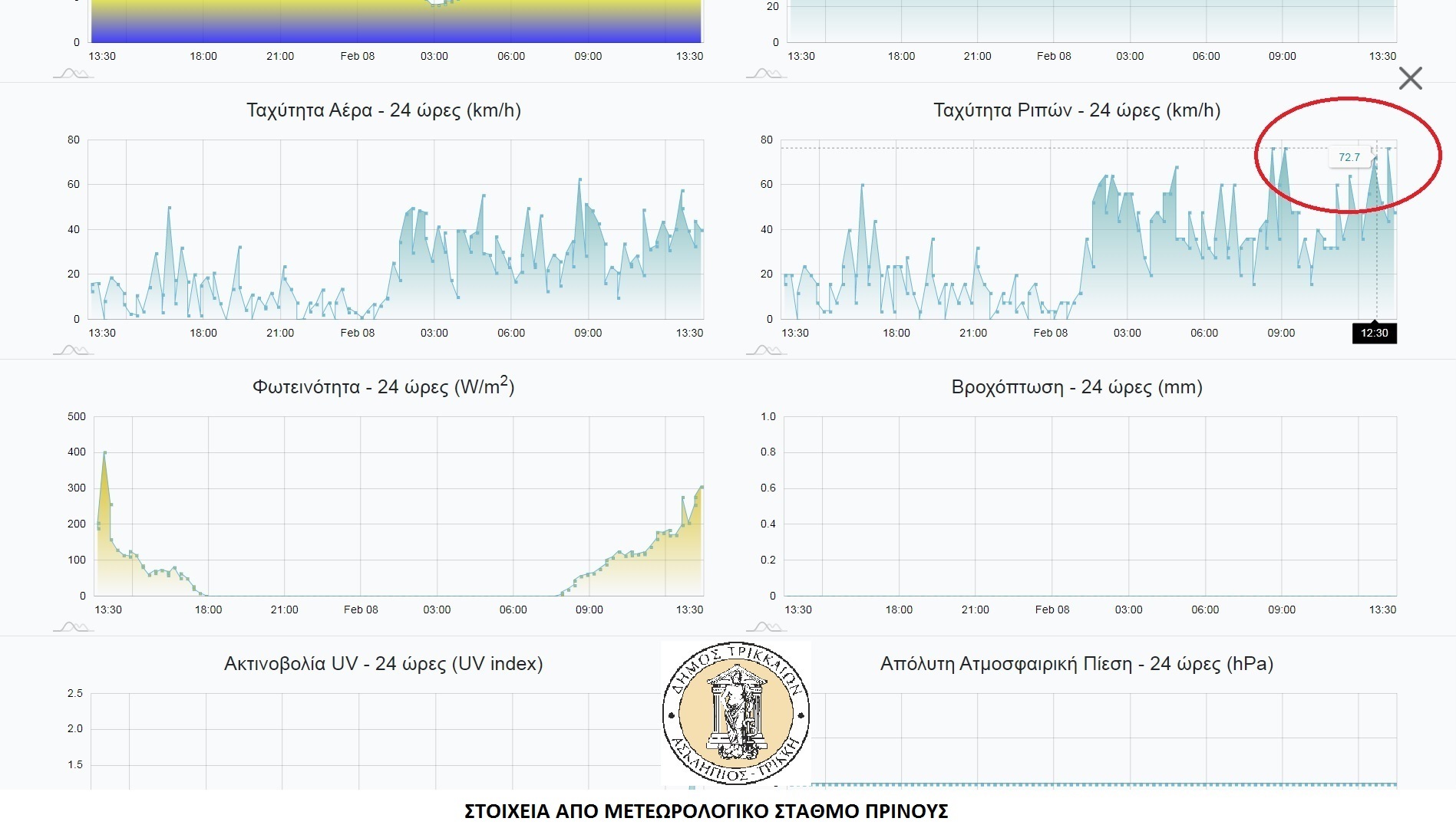 Ο Δήμος Τρικκαίων ενημερώνει και προειδοποιεί τους κατοίκους, να είναι ιδιαιτέρως προσεκτικοί από τους θυελλώδεις ανέμους που ενέσκηψαν σε όλη την περιφέρεια του Δήμου. Σύμφωνα με τα στοιχεία από το Εθνικό Αστεροσκοπείο Αθηνών και τους Μετεωρολογικούς Σταθμούς του Δήμου Τρικκαίων, καταγράφηκαν ριπές ανέμων μέχρι και 80 χιλιόμετρα ανά ώρα στον Δήμο και έως 50 χιλιόμετρα ανά ώρα στο κέντρο της πόλης! Σύμφωνα με τις προγνώσεις, τα φαινόμενα θα διαρκέσουν τουλάχιστον μέχρι τις πρώτες βραδινές ώρες.