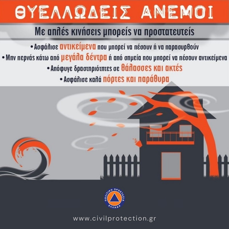 Σύμφωνα με τις Οδηγίες του Υπουργείου Κλιματικής Κρίσης και Πολιτικής Προστασίας για τους θυελλώδεις ανέμους: