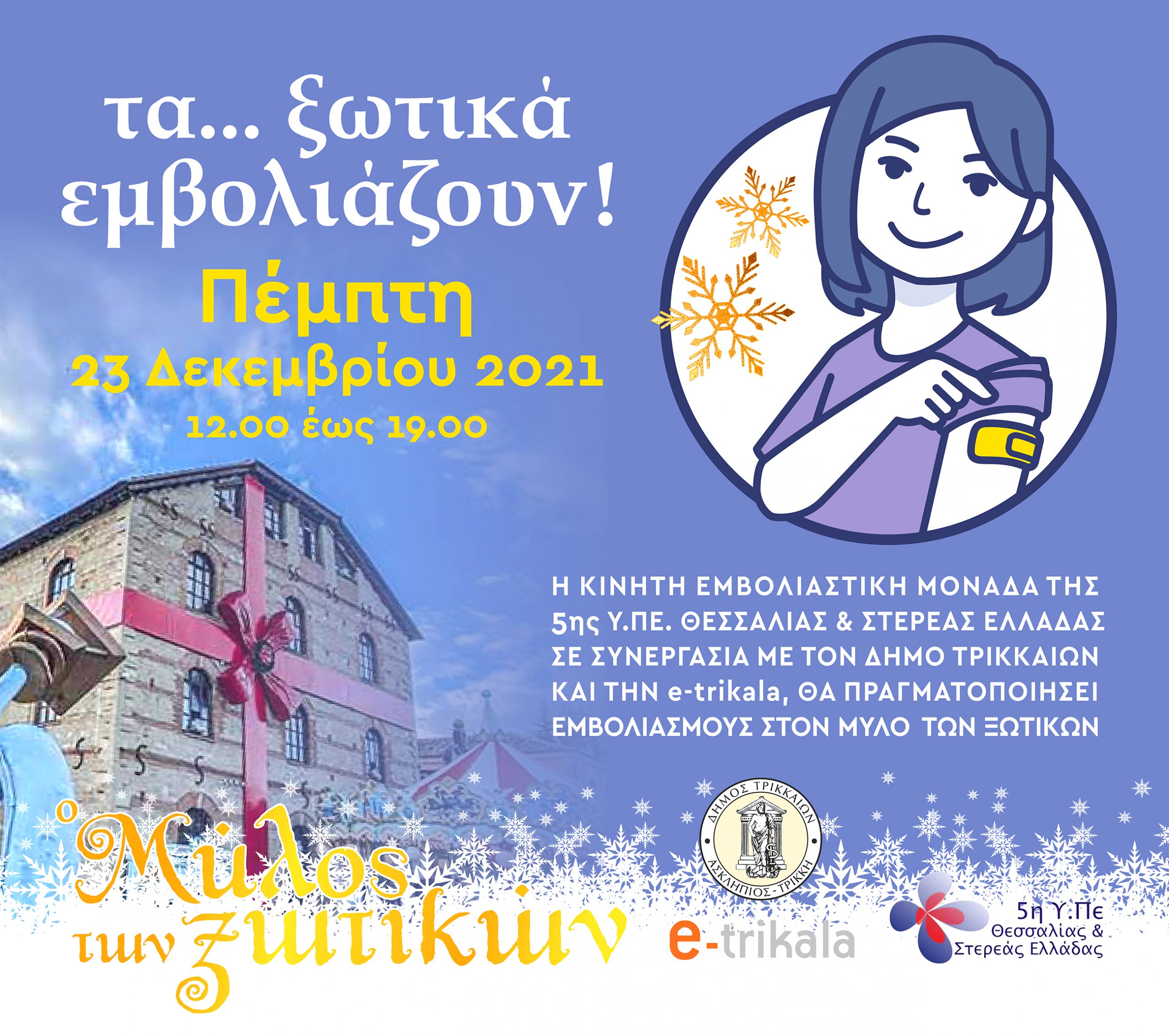Με μια σημαντική απόφαση υπέρ της προστασίας της δημόσιας υγείας, ο Δήμος Τρικκαίων, η e-trikala ΑΕ και η 5η Υγειονομική Περιφέρεια Θεσσαλίας και Στ. Ελλάδας συνεργάζονται για εμβολιασμό έξω από τον Μύλο των Ξωτικών.
