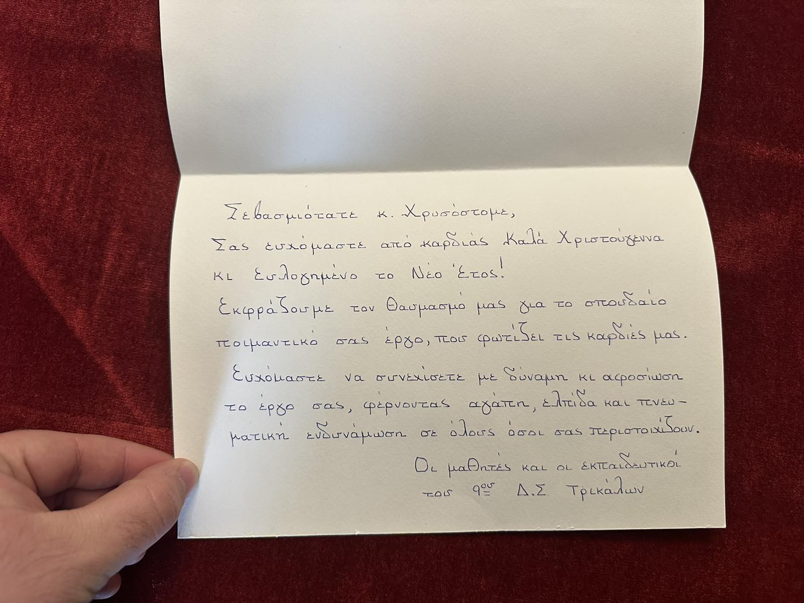 Ο Σεβασμιώτατος, με χαρακτηριστική ζεστασιά, καλωσόρισε τα παιδιά και άκουσε με προσοχή τα κάλαντα. Αφού ευχαρίστησε τους μαθητές για την όμορφη πρωτοβουλία τους, μοιράστηκε στιγμές σοφίας και αγάπης, επισημαίνοντας τη σημασία της προσοχής στους γονείς και τους δασκάλους, καθώς και της συνεχούς προσπάθειας για εξέλιξη.