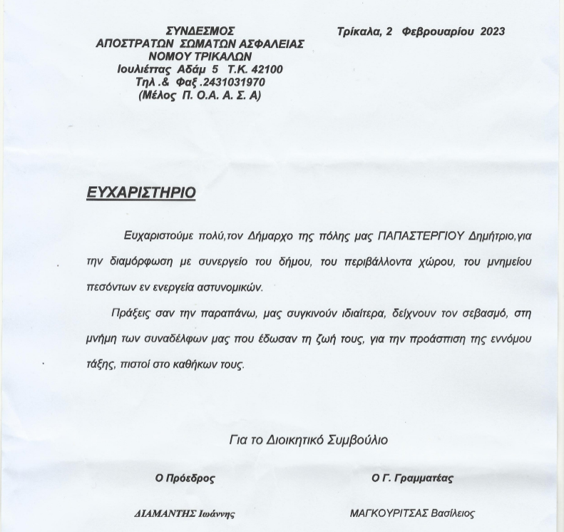 Ευχαριστήριο του Συνδέσμου Αποστράτων Σωμάτων Ασφαλείας προς τον Δ. Παπαστεργίου.
