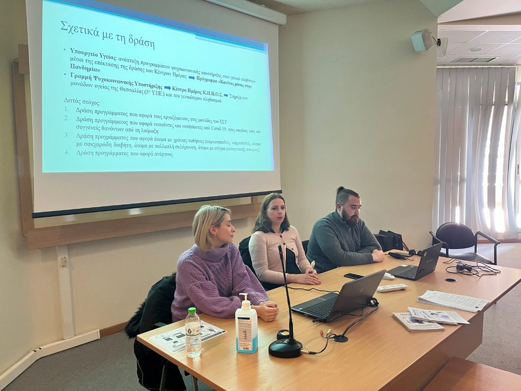 Ο αντιδήμαρχος Νίκος Σακκάς επεσήμανε τη συνολική δράση του Δήμου Τρικκαίων τα χρόνια της πανδημίας, τονίζοντας τη σημασία των υπηρεσιών του και των προσπαθειών σε επίπεδο στήριξης των πολιτών. Η δράση επικεντρώθηκε σε θέματα ψυχολογικής και κοινωνικής υποστήριξης ατόμων και υγειονομικών που επιβαρυνθεί από την πανδημία. Εκτός από τις παρουσιάσεις ομιλίες, μοιράστηκαν και φυλλάδια με σχετικό αντικείμενο.