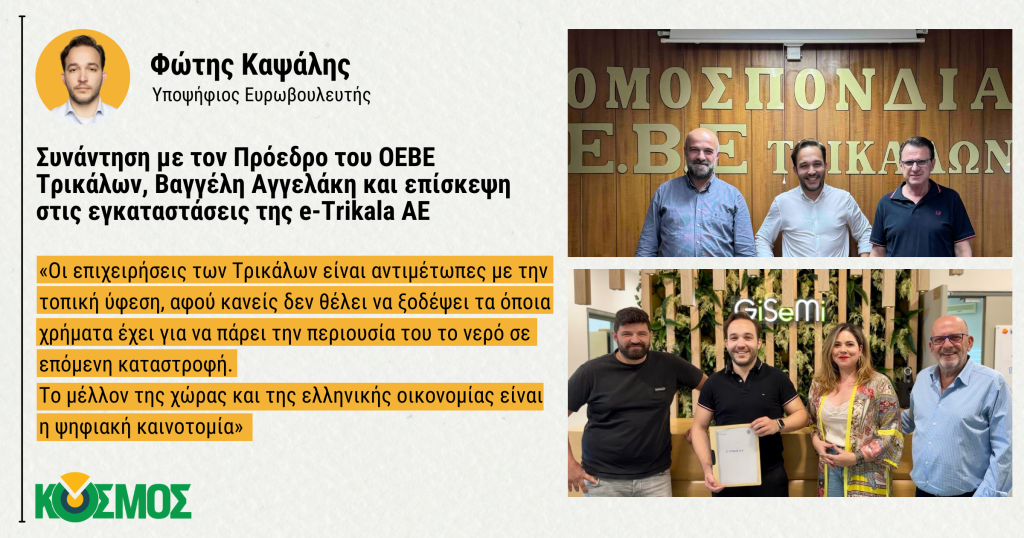 Στη συνέχεια ο υποψήφιος Ευρωβουλευτής με το ΚΟΣΜΟΣ, επισκέφτηκε το e-trikala όπου ξεναγήθηκε στους χώρους και ενημερώθηκε για τη δραστηριότητά της εταιρίας από τον πρόεδρο του e-trikala, Χριστόφορο Ρόμπο, και τον Διευθύνοντα Σύμβουλο, Οδυσσέα Ράπτη. Τα καινοτόμα ψηφιακά έργα στα Τρίκαλα συμβάλλουν στην βελτίωση της ποιότητας ζωής των κατοίκων και συχνά αποτελούν και πρότυπο για άλλες πόλεις.