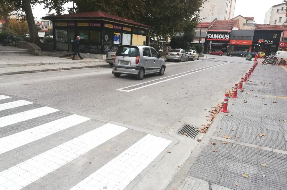 Η υπάρχουσα λωρίδα με κυβόλιθους υποδεικνύει τον διαχωρισμό από τον χώρο στάσης των αστικών και ήδη γίνονται οι σχετικές διαγραμμίσεις.