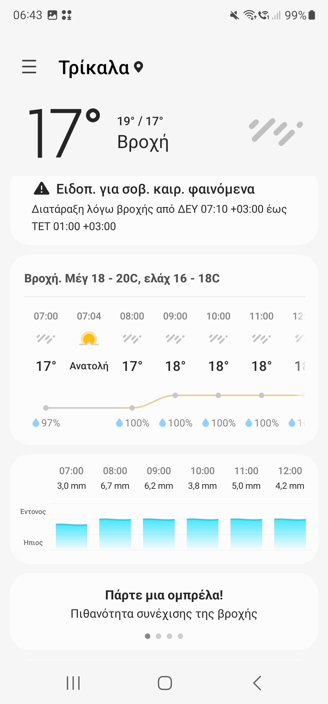 Έντονες καταιγίδες εκδηλώνονται από τα ξημερώματα της Τρίτης, όπως προειδοποιούσαν κιόλας οι μετεωρολόγοι, σε όλο το ν. Τρικάλων.
