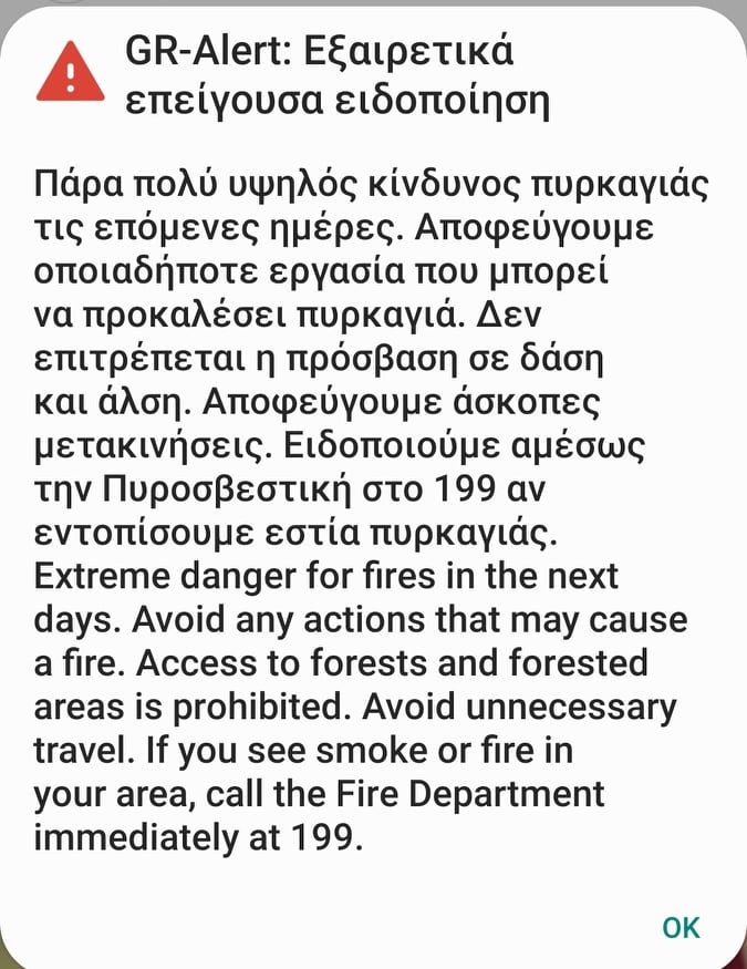Το μήνυμα από την Πολιτική Προστασία προειδοποιεί για αυξημένο κίνδυνο πυρκαγιάς και γνωστοποιεί την απαγόρευση κυκλοφορίας στα δάση και στα άλση του νομού μας.