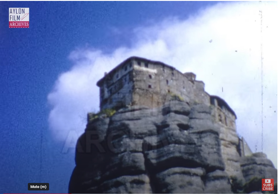 Μετέωρα 1965-Βουβό έγχρωμο φιλμ 8mm – Αρχείο Δ. Κιριμλίδη. Ο κινηματογραφιστής επισκέπτεται τα μοναστήρια των Μετεώρων. Το φιλμ ανοίγει με τους γιγαντιαίους βράχους και την Μονή Βαρλαάμ ή μονή των Αγίων Πάντων, ένα ανδρικό μοναστήρι, στην κορυφή απότομου βράχου ενώ έπειτα βλέπουμε απόψεις απ’ το εντυπωσιακό τοπίο. Ο φακός στέκεται στη μονή Αγ. Νικολάου Αναπαυσά και μας δίνει ένα ακόμα γενικό πλάνο της περιοχής με φόντο τις χιονισμένες βουνοκορφές της Πίνδου.