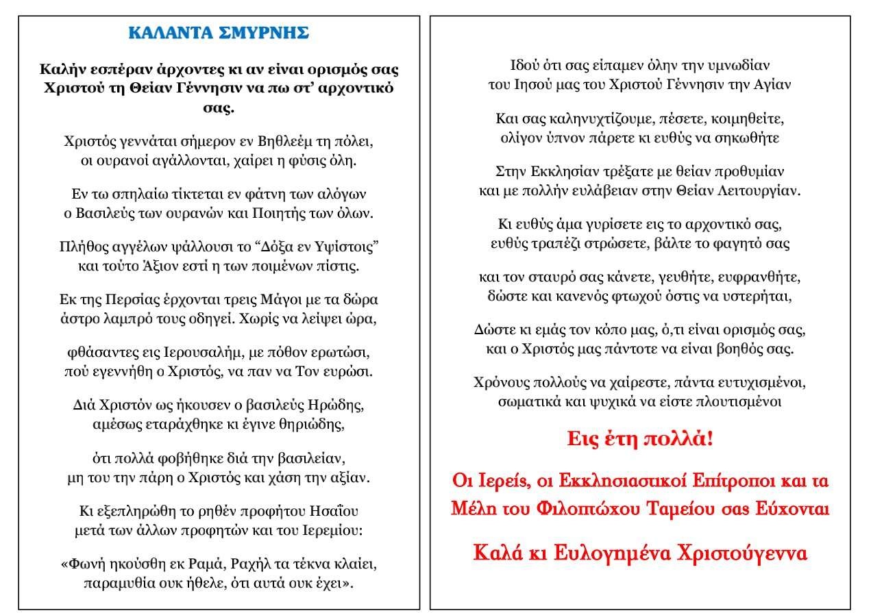 Οι Κύριες του Φιλοπτώχου και Κατηχήτριες και διακονήτριες του Ναού τραγουδούσαν στο πολυπληθές Εκκλησίασμα τα Χριστουγεννιάτικα Κάλαντα της Σμύρνης…με το σύνθημα: