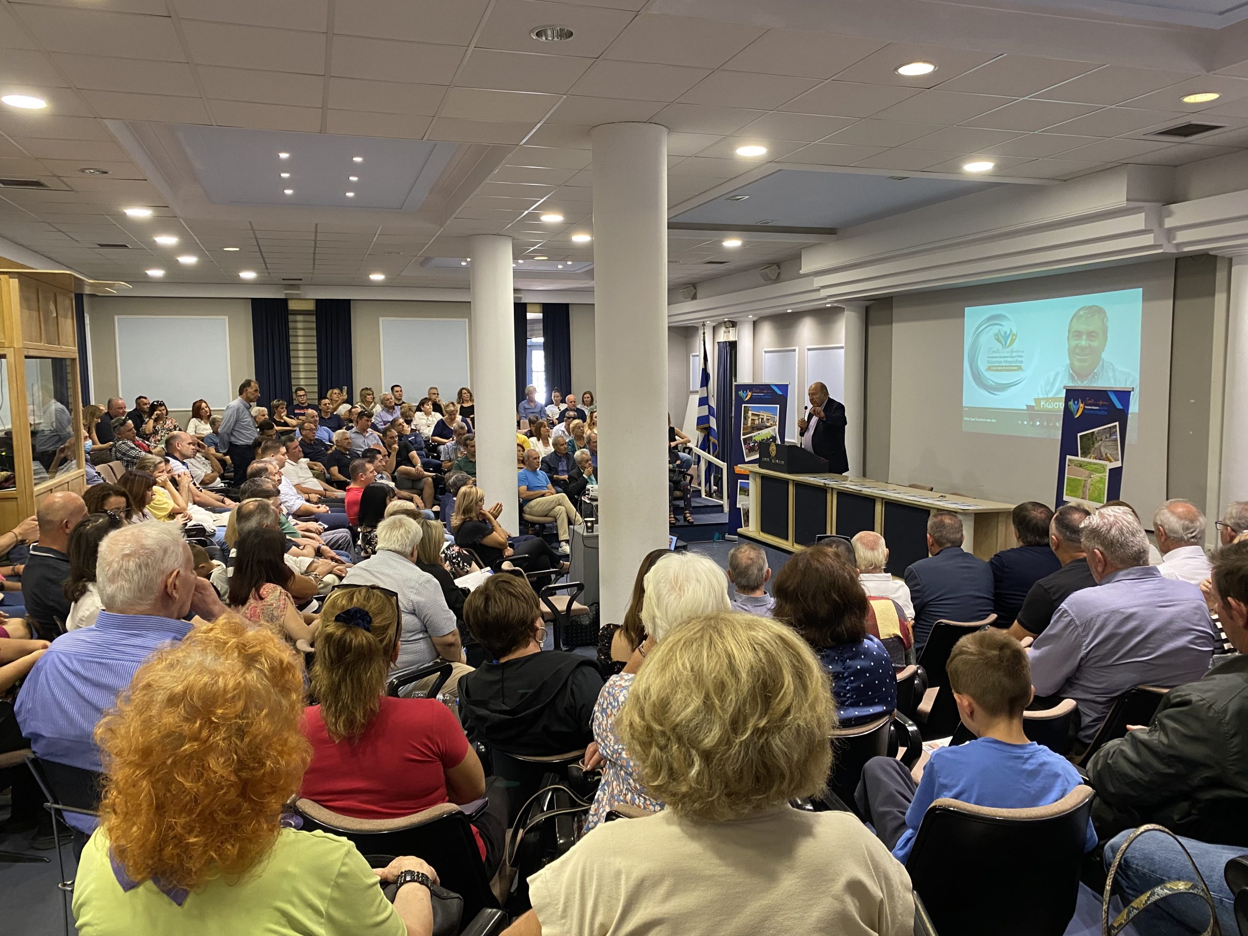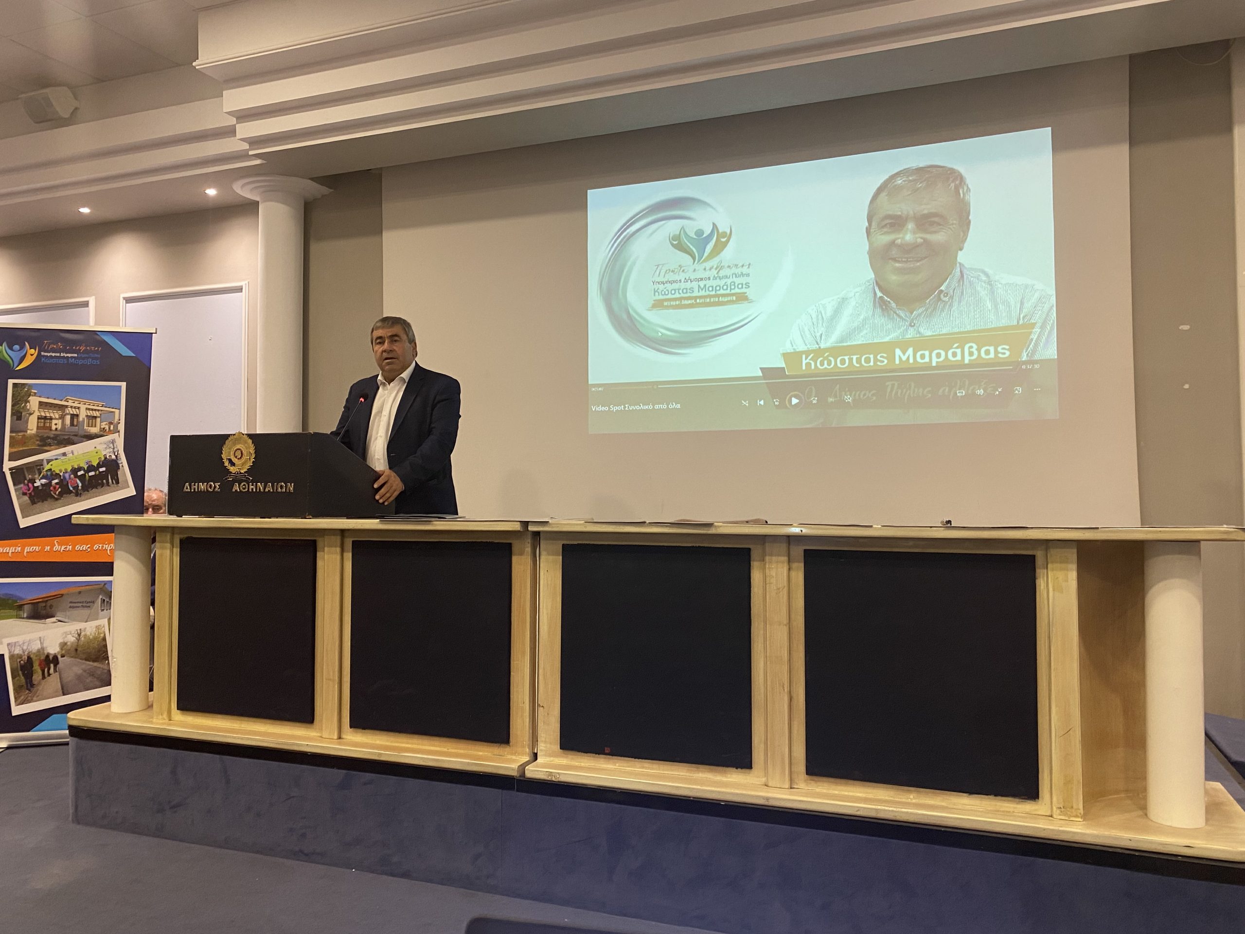 Σε μία εντυπωσιακά μεγάλη συγκέντρωση ετεροδημοτών, στην αίθουσα του  Πνευματικού Κέντρου του Δήμου Αθηναίων – Αμφιθέατρο Αντώνης Τρίτσης –  στην οδό Ακαδημίας 50,– που αποδείχθηκε πολύ μικρή- μίλησε ο δήμαρχος Πύλης Κώστας Μαράβας.