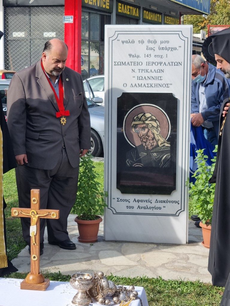 Παρουσία του εκπροσώπου του Οικουμενικού Πατριάρχου Βαρθολομαίου, Αρχιμανδρίτου Λάζαρου Θεοδοσίου, του Πρωτοσυγκέλλου της Μητροπόλεως Τρίκκης Αλεξίου Κανίνα, του προέδρου της Ομοσπονδίας Ιεροψαλτών Κωνσταντίνου Πολίτη, του προέδρου του Σωματείου Ιεροψαλτών Τρικάλων Θανάση Δημητρίου, ιεροψαλτών και της εκπροσώπου της Περιφέρειας Θεσσαλίας Δήμητρας Νάτσινα, πραγματοποιήθηκε το πρωί του Σαββάτου η αποκάλυψη της Αναθηματικής Πλάκας προς τιμήν των “Αφανών Ιεροψαλτών” που διακόνησαν και διακονούν το Αναλόγιο από αιώνων.