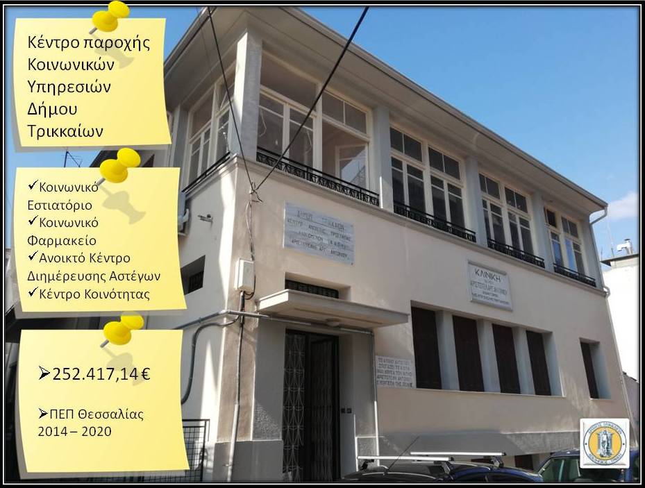 Το Κοινωνικό Εστιατόριο, το Κοινωνικό Φαρμακείο και το Ανοικτό Κέντρο Διημέρευσης Αστέγων, μεταφέρονται οριστικά στο κτήριο της οδού Ομήρου, στον «Κόμβο Κοινωνικό Δομών». Έναν κόμβο, που θα στεγάσει σύντομα και το Κέντρο Κοινότητας του Δήμου Τρικκαίων, μαζί με το παράρτημα για τους Ρομά και το Κέντρο Ενταξης Μεταναστών.
