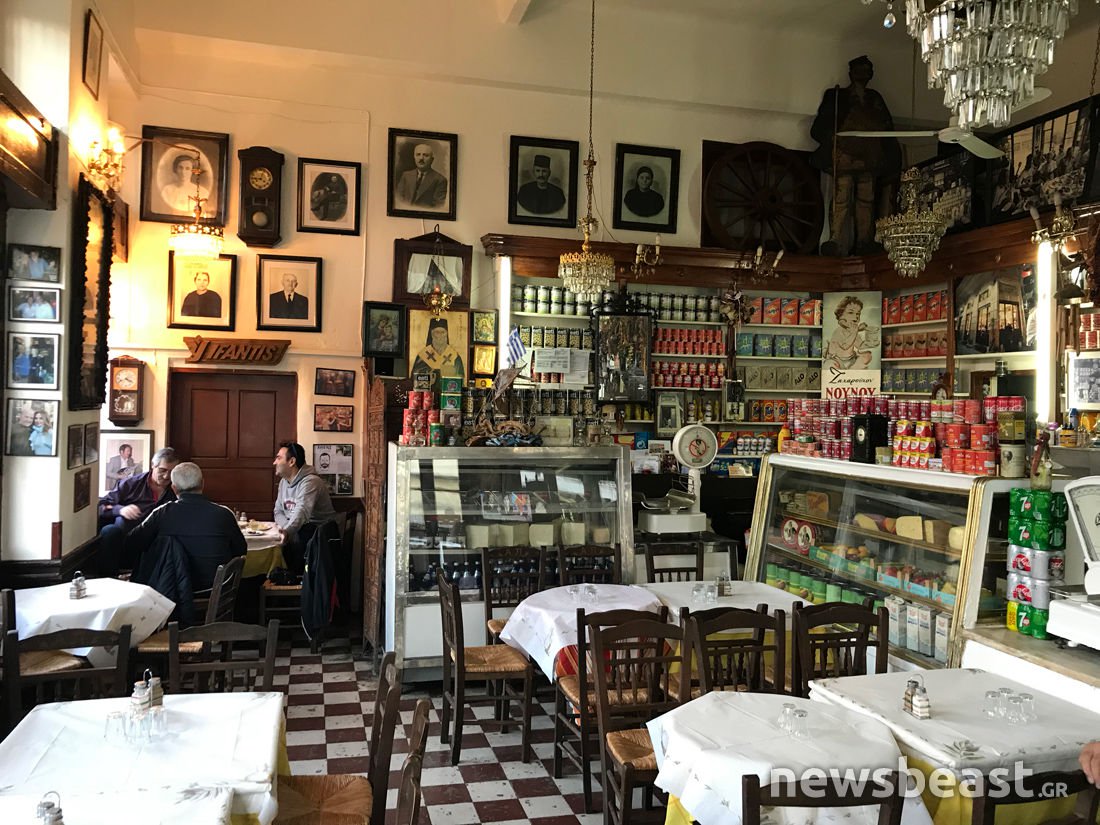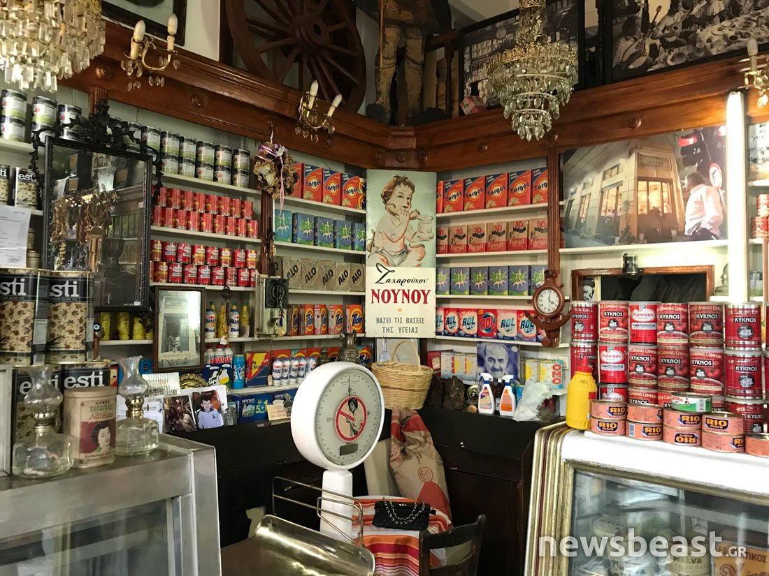 Το εσωτερικό απείραχτο εδώ και έναν αιώνα, ένα σκηνικό φτιαγμένο από το χρόνο κι όχι από επαγγελματίες διακοσμητές, να θυμίζει έντονα «Ελλάδα». Το παμπάλαιο ψυγείο «εν Ελλάδι 1938» με το ξυλόγλυπτο σκάλισμα λειτουργεί κανονικά στο μαγαζί, παλιά ραδιόφωνα, πολυέλαιοι, τσαγιέρες, ζυγαριές, φιγούρες από θέατρο σκιών, κοσνερβοκούτια, κουτιά Tide, παλιές ταμπέλες, φωτογραφίες από σπουδαίους Έλληνες που έχουν περάσει από εδώ, όπως ο Τσιτσάνης, ο Καζαντζίδης, ο Παπαϊωάννου.