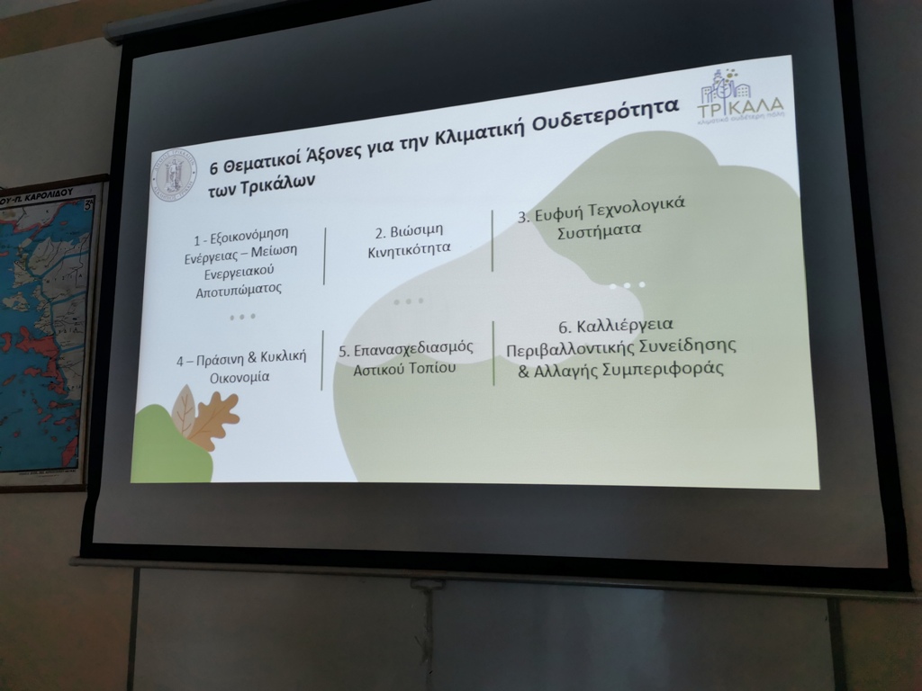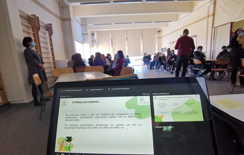 Για αυτό, από το 1ο Λύκειο Τρικάλων, με τη συνεργασία της διευθύντριας κ. Αθ. Ζαραμπούκα και εκπαιδευτικών, δύο ειδικοί συνεργάτες του Δήμου, οι κ.κ. Χάρης Καλλιάρας και Κωνσταντίνα Ζαχαρή, παρουσίασαν όλον τον σχεδιασμό για την Κλιματικά Ουδέτερη Πόλη: τι είναι, τι επιδιώκει, τι θέλει να προωθήσει ο Δήμος, ποιες θεματικές υφίστανται, πώς μπορούν να προωθηθούν λύσεις, ποιες ιδέες υπάρχουν. Ακολούθησε διεξαγωγή εργαστηρίου με αντικείμενο ακριβώς αυτά τα ζητήματα. Η ίδια διαδικασία θα επαναλαμβάνεται κάθε εργάσιμη ημέρα σε κάθε Λύκειο των Τρικάλων. Με το πέρας των Εργαστηρίων, οι καταγραμμένες απόψεις, προτάσεις και ιδέες θα συγκεντρωθούν και θα αποτελέσουν τμήμα του φάκελου υποψηφιότητας, ενταγμένες και στις προτάσεις που θα υποβληθούν.