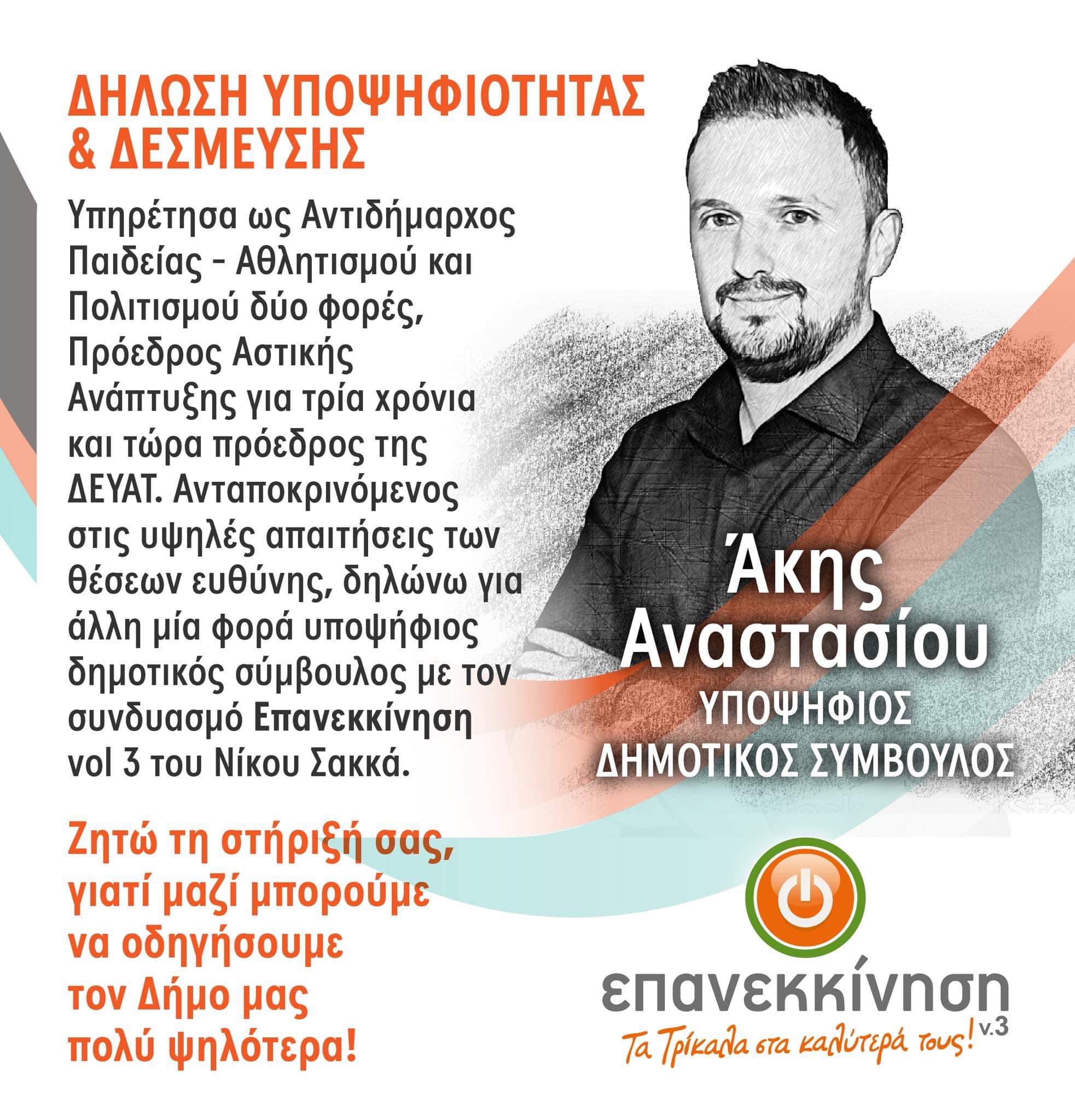 Ο Άκης Αναστασίου ήταν ένα από τα πρώτα πρόσωπα που στάθηκαν δίπλα στον Δημήτρη Παπαστεργίου το 2014, εκλέχτηκε με τη μια και επανεκλέχτηκε το 2019. Με “όπλο” στη φαρέτρα του το έργο που έκανε σε θέσεις ευθύνης που κλήθηκε, είτε ως αντιδήμαρχος, είτε ως πρόεδρος της ΔΕΥΑΤ, διεκδικεί μια τρίτη θητεία με την “Επανεκκίνηση v.3”.