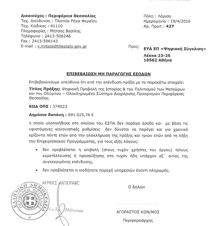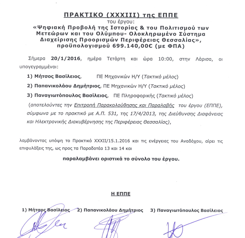 – Το έργο ΄΄ Ψηφιακή Προβολή της Ιστορίας και του Πολιτισμού των Μετεώρων ΄΄ συμβασιοποιήθηκε το 2011 από τον Περιφερειάρχη Θεσσαλίας κ. Κώστα Αγοραστό , τον Δήμαρχο Μετεώρων κ. Δημήτρη Σακελλαρίου και τον Πρόεδρο του Επιμελητηρίου Τρικάλων κ. Βασίλη Γιαγιάκο .