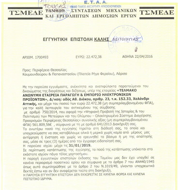 – Σημειώνεται δε ότι η εγγύηση καλής λειτουργίας του έργου παρήλθε στις 31/01/2019 .