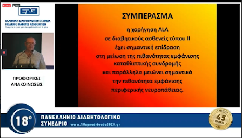 Για άλλη μια φορά διακρίθηκε εργασία του Τρικαλινού Ενδοκρινολόγου – Διαβητολόγου γιατρού Δημητρίου Καραλή στο 18ο Πανελλήνιο Διαβητολογικό Συνέδριο που διεξήχθη στην Αθήνα, στο Ξενοδοχείο HILTON, από 16 – 20 Σεπτεμβρίου 2020. Η εργασία με τίτλο « Η ΕΠΙΔΡΑΣΗ ΤΟΥ α-ΛΙΠΟΪΚΟΥ ΟΞΕΩΣ ΣΤΗ ΔΙΑΒΗΤΙΚΗ ΝΕΥΡΟΠΑΘΕΙΑ ΚΑΙ ΣΤΗΝ ΕΠΕΡΧΟΜΕΝΗ ΚΑΤΑΘΛΙΠΤΙΚΗ ΣΥΝΔΡΟΜΗ ΔΙΑΒΗΤΙΚΩΝ ΤΥΠΟΥ ΙΙ» θεωρήθηκε πρωτοποριακή, πρωτότυπη και πολλά υποσχόμενη για την αντιμετώπιση των συγκεκριμένων επιπλοκών του Σακχαρώδη Διαβήτη τύπου ΙΙ.