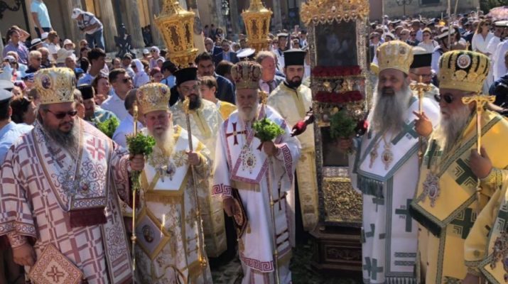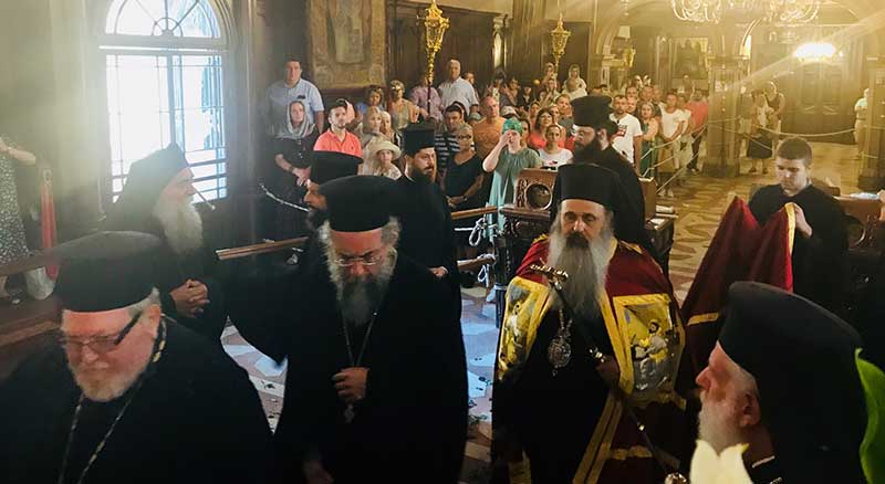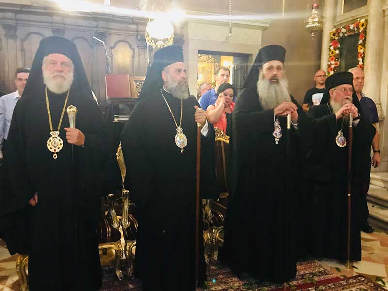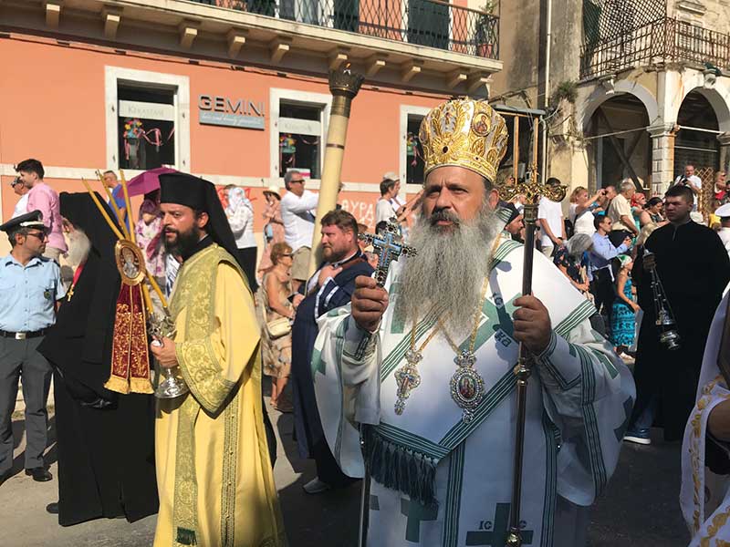 Το απόγευμα του Σαββάτου 10 Αυγούστου 2019 τελέστηκε στο Ιερό Προσκύνημα του Αγίου και Θαυματουργού Σπυρίδωνος Πολυαρχιερατικός Πανηγυρικός Εσπερινός, επί τη αναμνήσει του θαύματος του Αγίου και της απαλλαγής της νήσου από τους Αγαρηνούς το έτος 1716, χοροστατούντος του Σεβασμιωτάτου Μητροπολίτου Λαρίσης και Τυρνάβου κ. Ιερωνύμου και συγχοροστατούντων των Σεβασμιωτάτων Μητροπολιτών Σύρου, Τήνου, Άνδρου, Κέας, Μυκόνου κ. Δωροθέου, Θεσσαλιώτιδος και Φαναριοφερσάλων κ. Τιμοθέου, Σταγών και Μετεώρων κ. Θεοκλήτου, Φιλίππων, Νεαπόλεως και Θάσου κ. Στεφάνου και του επιχώριου Μητροπολίτου Κερκύρας, Παξών και Διαποντίων Νήσων Νεκταρίου.