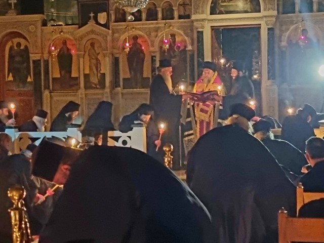 Πριν το τέλος του Εσπερινού ανέγνωσε την συγχωρητική ευχή στους πατέρες και τους πιστούς και όλοι αντάλλαξαν μεταξύ τους τον ασπασμό της αγάπης και της συγχωρήσεως, αιτούμενοι και παρέχοντες συγχώρεση, όπως ορίζει η τάξη της Αγίας μας Εκκλησίας, ευχόμενοι μεταξύ τους Καλή Τεσσαρακοστή.