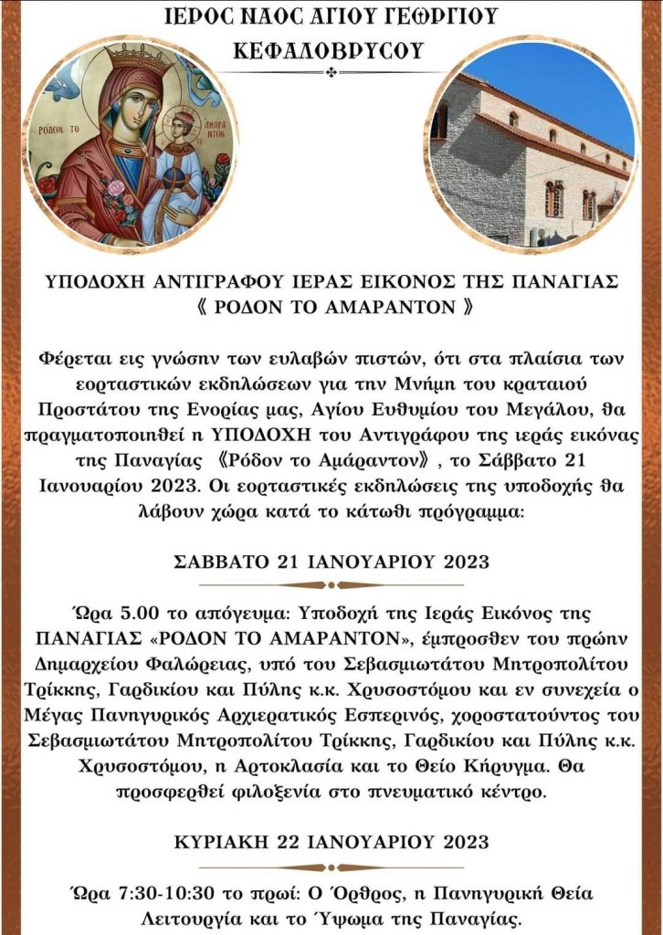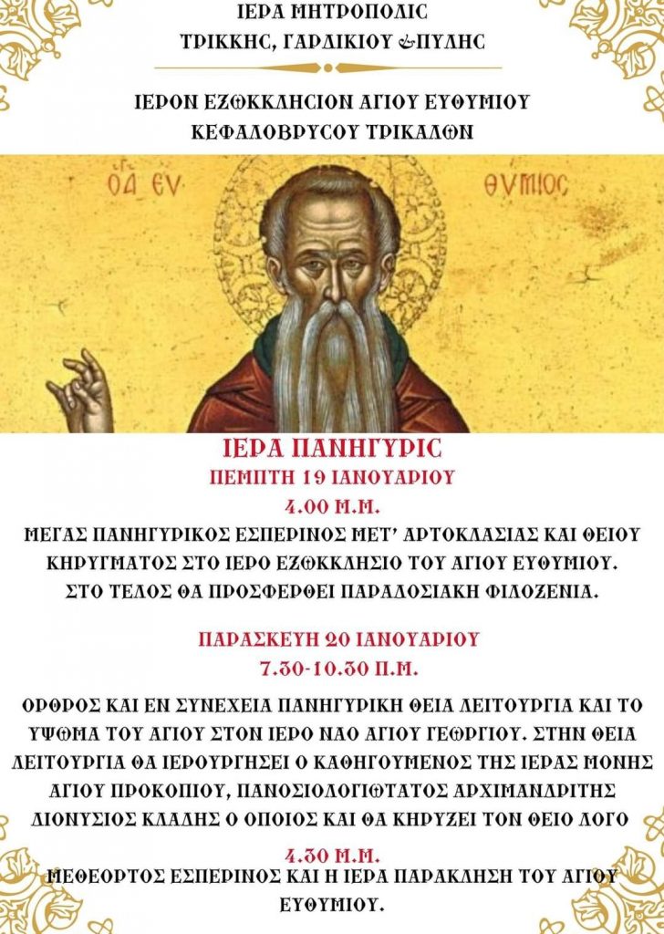Τριήμερες λατρευτικές εκδηλώσεις στο Κεφαλόβρυσο Τρικάλων επί τη εορτή του Αγίου Ευθυμίου.