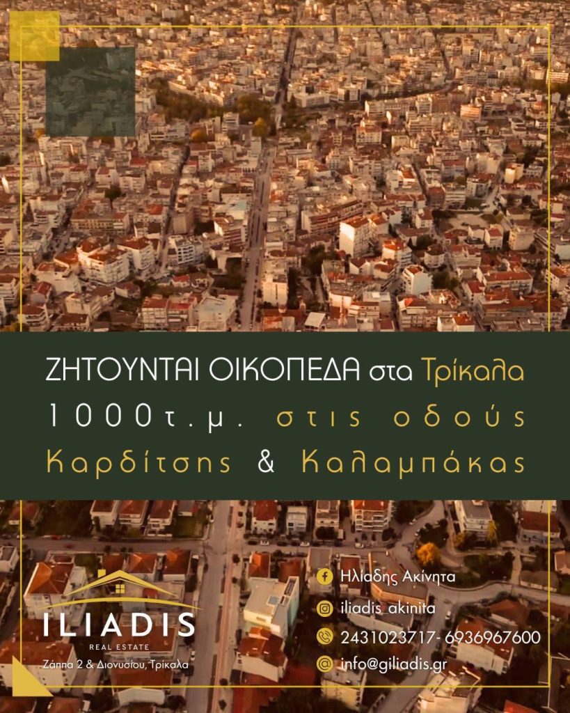 Οικόπεδα 1.000 τ.μ. αναζητά στα Τρίκαλα και συγκεκριμένα στις οδούς Καλαμπάκας και Καρδίτσης το μεσιτικό γραφείο “Ηλιάδης Ακίνητα”.