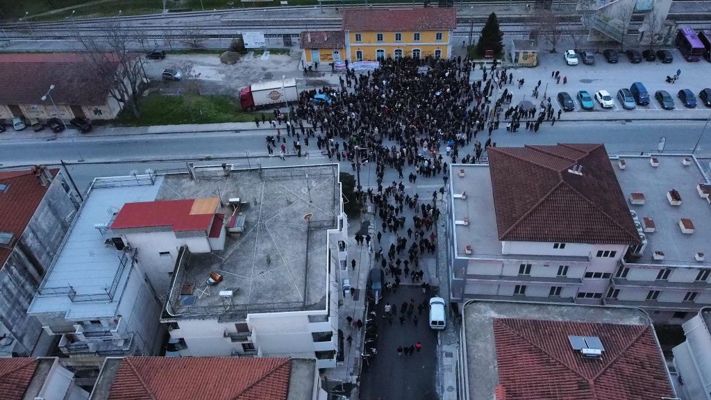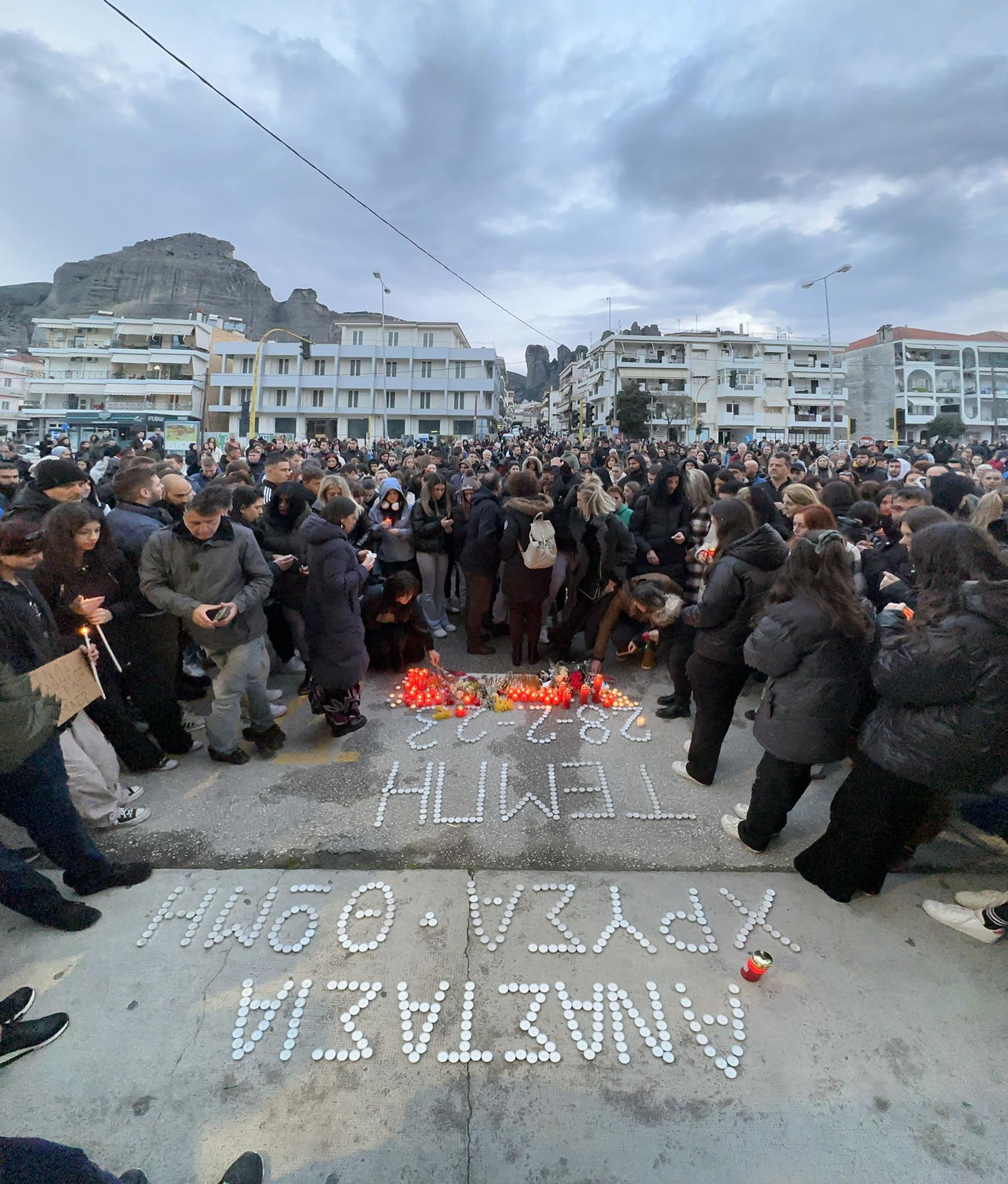 Συγκεντρώθηκαν στην κεντρική πλατεία της Καλαμπάκας, “έγραψαν” τα ονόματα των κοριτσιών στα πλακάκια και άναψα κεράκια. Στη συνέχεια και όπως κατέγραψε το trikalavoice.gr ξεκίνησαν με κεράκια στα χέρια, σιωπηλοί σε πορεία προς τον σταθμό του ΟΣΕ και άφησαν μαύρα μπαλόνια να φύγουν στον ουρανό. Η Καλαμπάκα πενθεί και πονάει.
