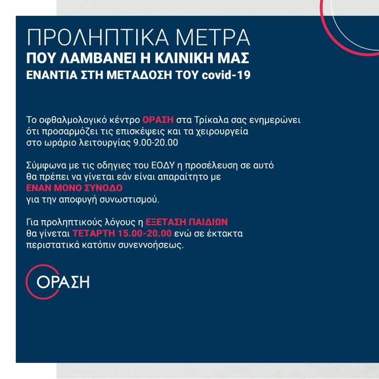 Το οφθαλμολογικό κέντρο ΟΡΑΣΗ στα Τρίκαλα σας ενημερώνει ότι προσαρμόζει τις επισκέψεις και τα χειρουργεία στο ωράριο λειτουργίας 9 π.μ.-8μμ.