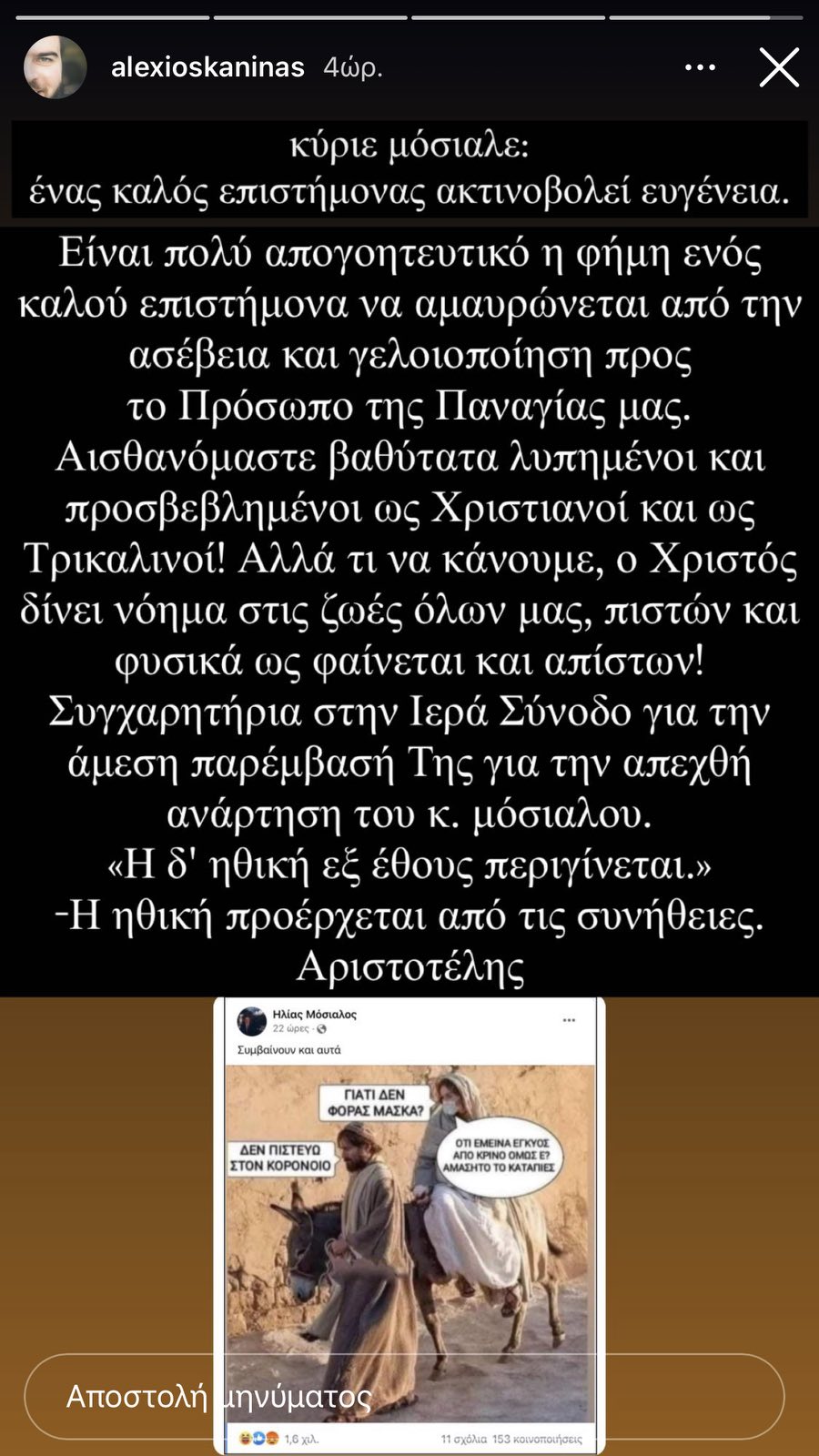 Αντιδράσεις εξακολουθεί να προκαλεί η απαράδεκτη ανάρτηση του Ηλία Μόσιαλου παραμονή Χριστουγέννων, προσβλητική για το πρόσωπο της ίδιας της Παναγίας μας.