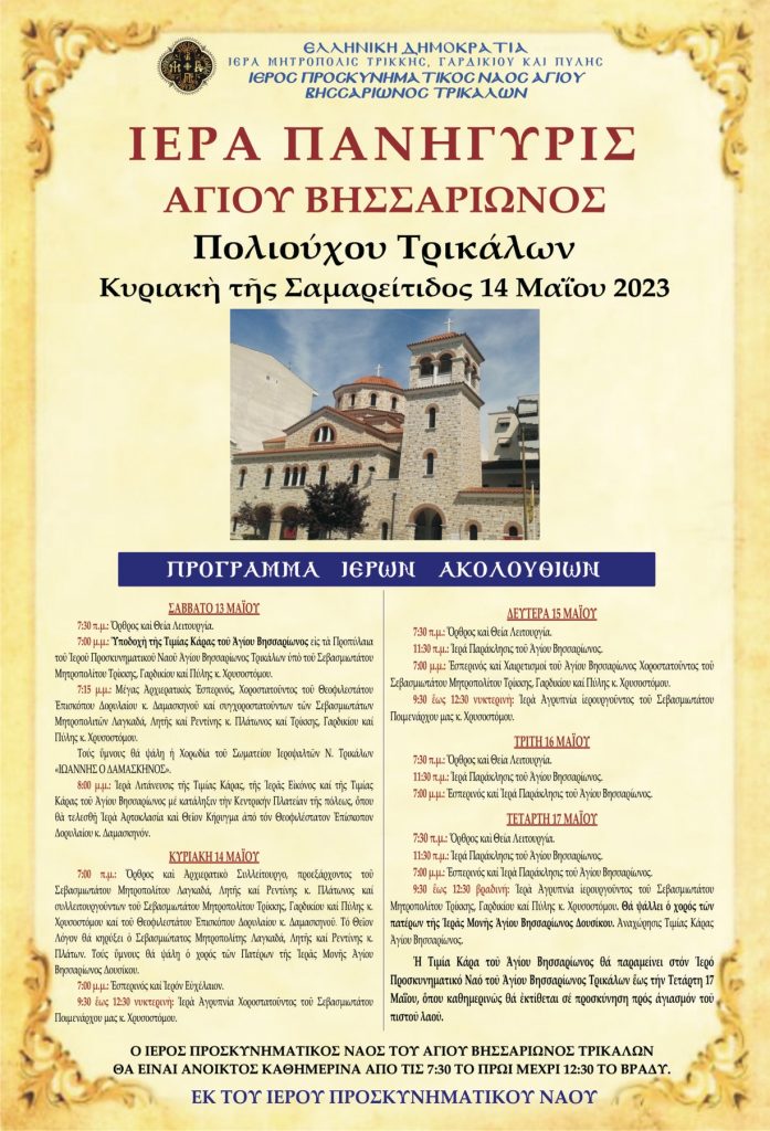Φέτος πέφτει στις 14 Μαϊου και οι λατρευτικές εκδηλώσεις θα ξεκινήσουν από την παραμονή, Σάββατο 13 του μηνός με την υποδοχή της Τιμίας Κάρας του και τη μεγάλη Λιτανεία στο κέντρο των Τρικάλων. Δείτε αναλυτικά το πρόγραμμα παρακάτω;