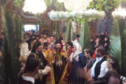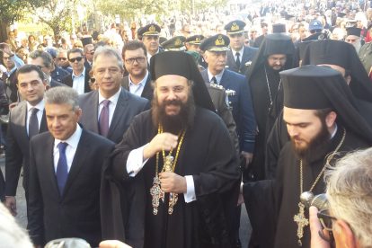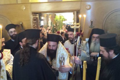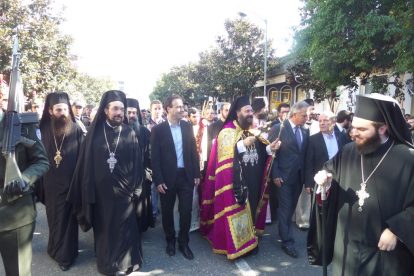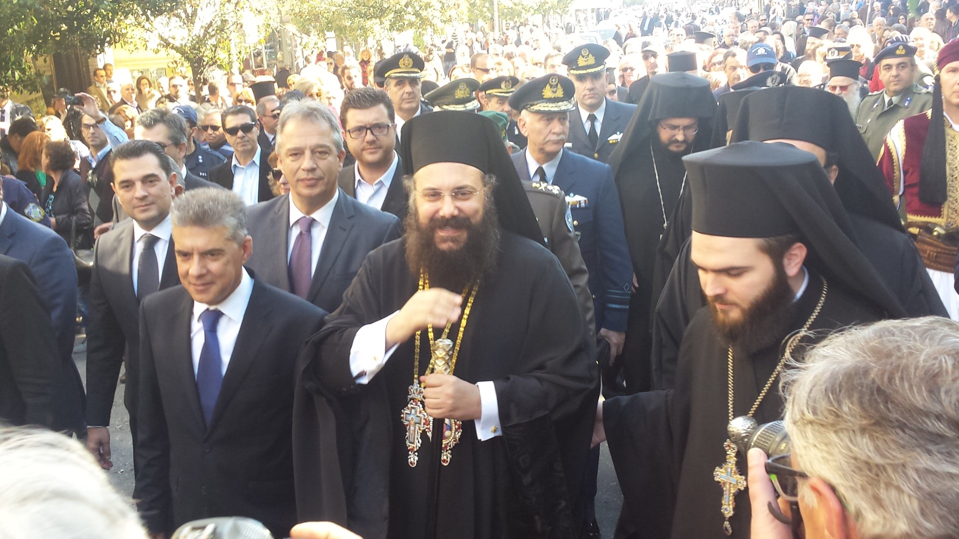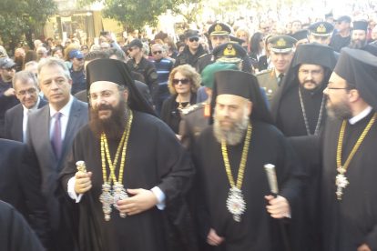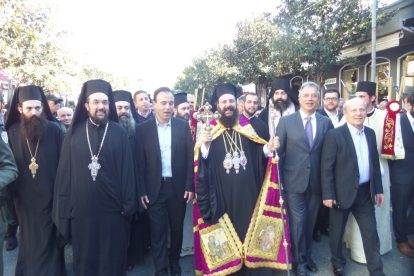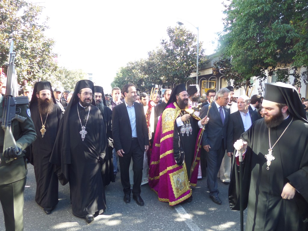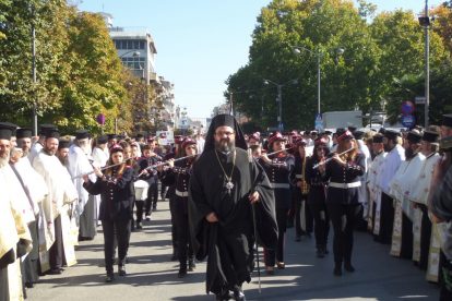 Ακολούθως σχηματίστηκε πομπή επί της οδού Στρατηγού Σαράφη και συνοδεία της Φιλαρμονικής Ορχήστρας του Δήμου Τρικκαίων και εν μέσω χειροκροτημάτων και της ιαχής «άξιος» ο κ. Χρυσόστομος και οι Αρχιερείς έφτασαν στον Μητροπολιτικό Ναό του Αγίου Νικολάου.