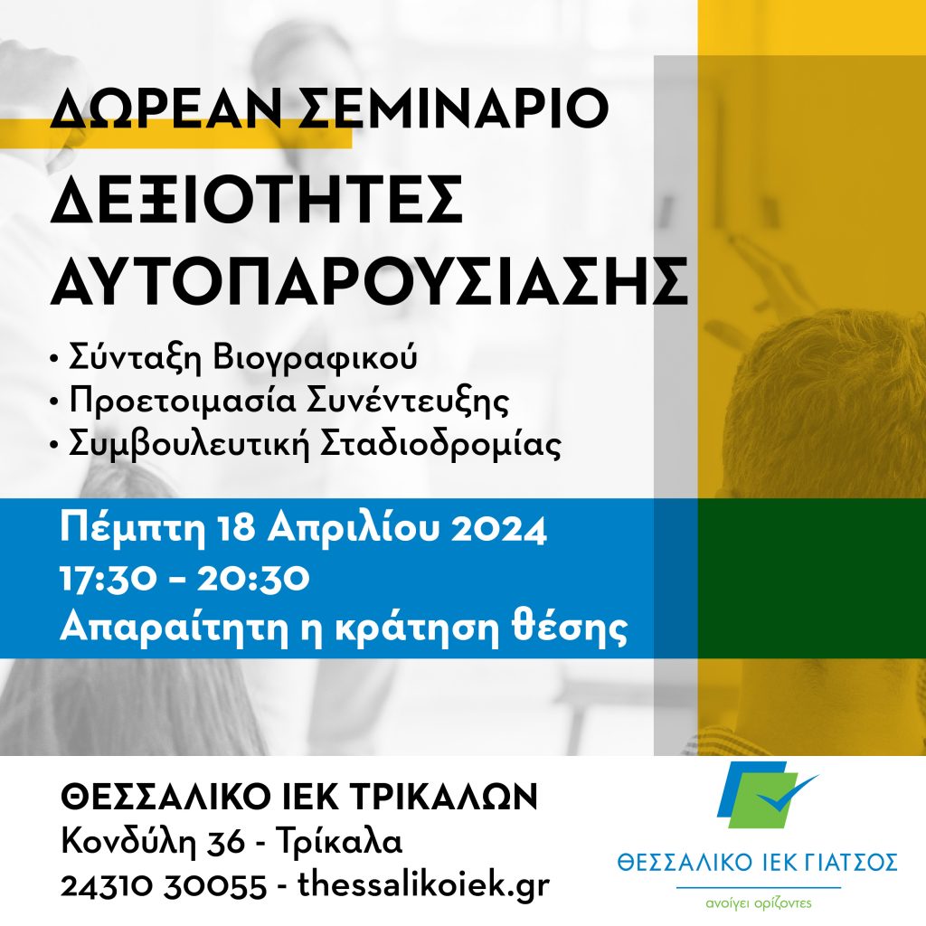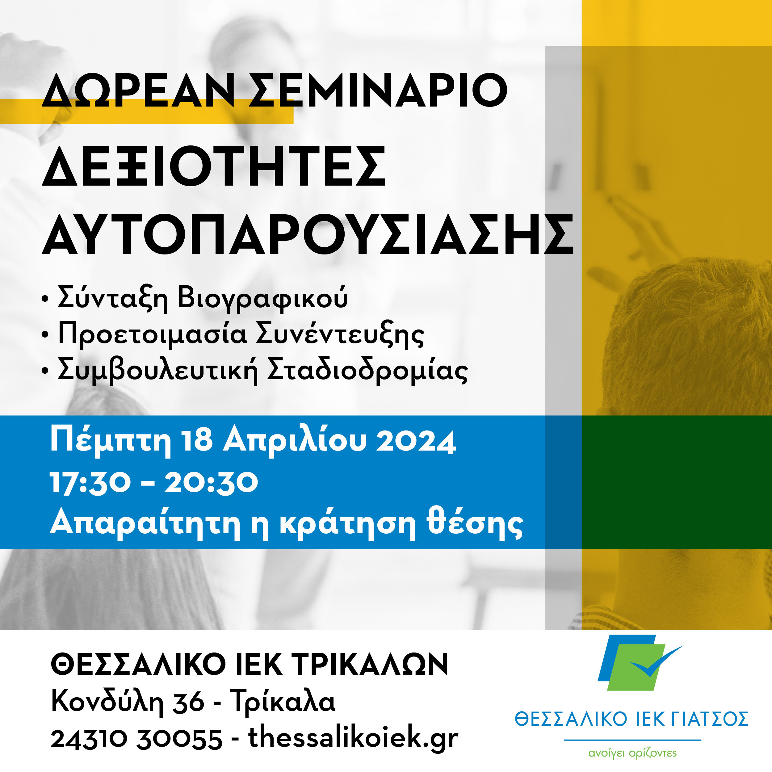 To ΘΕΣΣΑΛΙΚΟ ΙΕΚ ΤΡΙΚΑΛΩΝ διοργανώνει δωρεάν σεμινάριο όπου θα έχεις την ευκαιρία να δεις μια αναλυτική παρουσίαση της διαδικασίας σύνταξης βιογραφικού, την δημιουργία πλάνου και επιλογή στόχου, να μάθεις πληροφορίες και συμβουλές για την προετοιμασία και την συμμετοχή στη συνέντευξη αλλά και μια προσομοίωση συνέντευξης, καθώς και τις δεξιότητες που αναζητούν οι εργοδότες, πως αξιολογούν έναν συνεντευξιαζόμενο, και κάποιες επικοινωνιακές τακτικές. Τέλος θα πραγματοποιηθεί ολιγόλεπτη συνέντευξη των συμμετεχόντων.