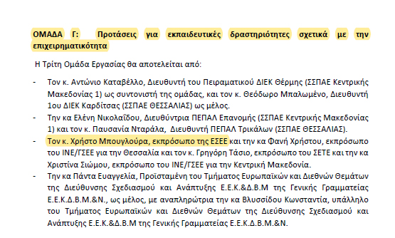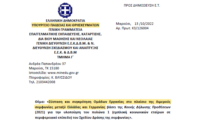 Δράσης της διμερούς συμφωνίας μεταξύ Ελλάδας και Γερμανίας βάσει της Κοινής Δήλωσης Προθέσεων (2021)» με τις ακόλουθες θεματικές: η Ομάδα Α θα διερευνήσει το ζήτημα «Ανίχνευση των τοπικών αναγκών», η Ομάδα Β το ζήτημα «Ενεργοποίηση τοπικών επιχειρήσεων για τις θέσεις μαθητείας ή πρακτικής άσκησης των μαθητών/μαθητευόμενων/καταρτιζόμενων» και η Ομάδα Γ το ζήτημα «Εκπαιδευτικές δραστηριότητες σχετικά με την επιχειρηματικότητα».