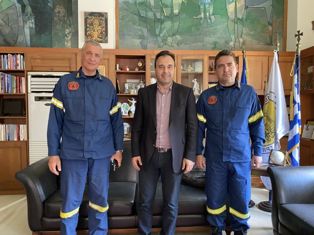 Ο νέος διοικητής Πυροσβεστικών Υπηρεσιών του νομού Τρικάλων, πύραρχος Ευάγγελος Τσιορλίδας και ο νέος διοικητής της Π.ΥΖ. Καλαμπάκας, αντιπύραρχος Βασίλης Παπαγεωργίου επισκέφθηκαν τον κ. Παπαστεργίου στο Δημαρχείο, την Τρίτη 7 Μαρτίου 2023. Η εθιμοτυπική συνάντηση, με την ευκαιρία της ανάληψης καθηκόντων των νέων αξιωματικών, ως διοικητών, εμπλουτίστηκε με τη συζήτηση για θέματα ενίσχυσης της συνεργασίας σε θέματα πρόσληψης, πυρόσβεσης, πολιτικής προστασίας. Η συνάντηση ανανεώθηκε για το επόμενο διάστημα, με περαιτέρω εξειδίκευση των θεμάτων αμοιβαίου ενδιαφέροντος.