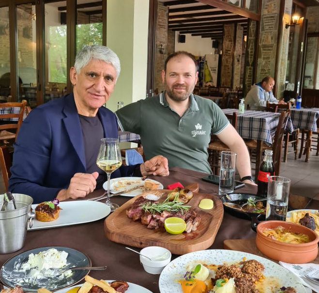 Ο θρύλος του Ελληνικού μπάσκετ μετά από σειρά επαφών και επισκέψεων σε σχολεία κατέληξε αργά το μεσημέρι στο πιο φημισμένο κατάστημα του ν. Τρικάλων για τα ξεχωριστά κρέατά του, ωρίμανσης και ιδιαίτερης κοπής, στον “Πλάτανο” στη Μύκανη. Δοκίμασε όλα τα ορεκτικά του νέου καταλόγου και τίμησε ιδιαιτέρως το black agnus ribay. Διακρίνεται με τον ιδιοκτήτη του καταστήματος, Θέμη Μπέλλο.