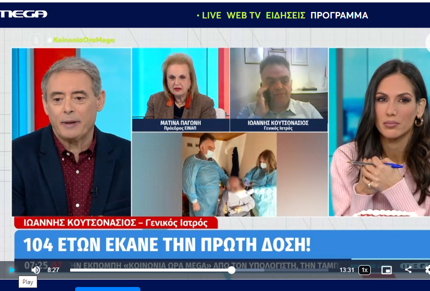 Για τη σημασία της τρίτης δόσης και τη μετάλλαξη Όμικρον μίλησαν η Ματίνα Παγώνη και ο Ιωάννης Κουτσονάσιος στην εκπομπή «Κοινωνία Ώρα MEGA». Ο ιατρός δε του Εμβολιαστικού Κέντρου Πύλης μίλησε ειδικότερα για τον εμβολιασμό του παππού 104 ετών προ ημερών, όπως αποκάλυψε το trikalavoice.gr (ΕΔΩ).