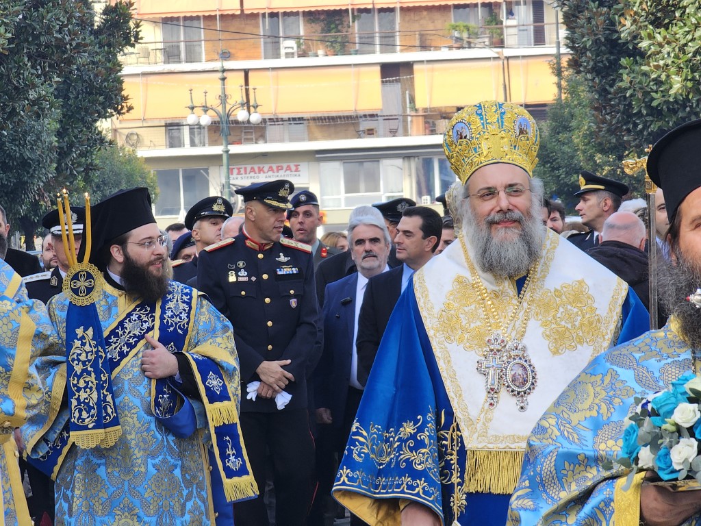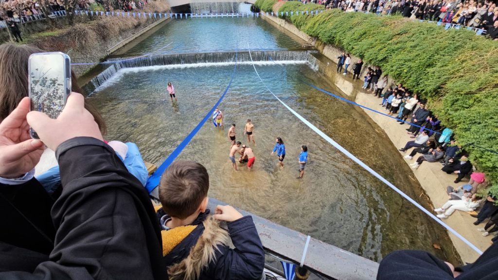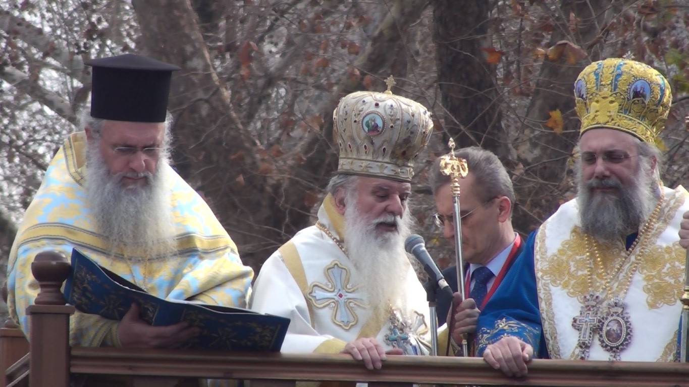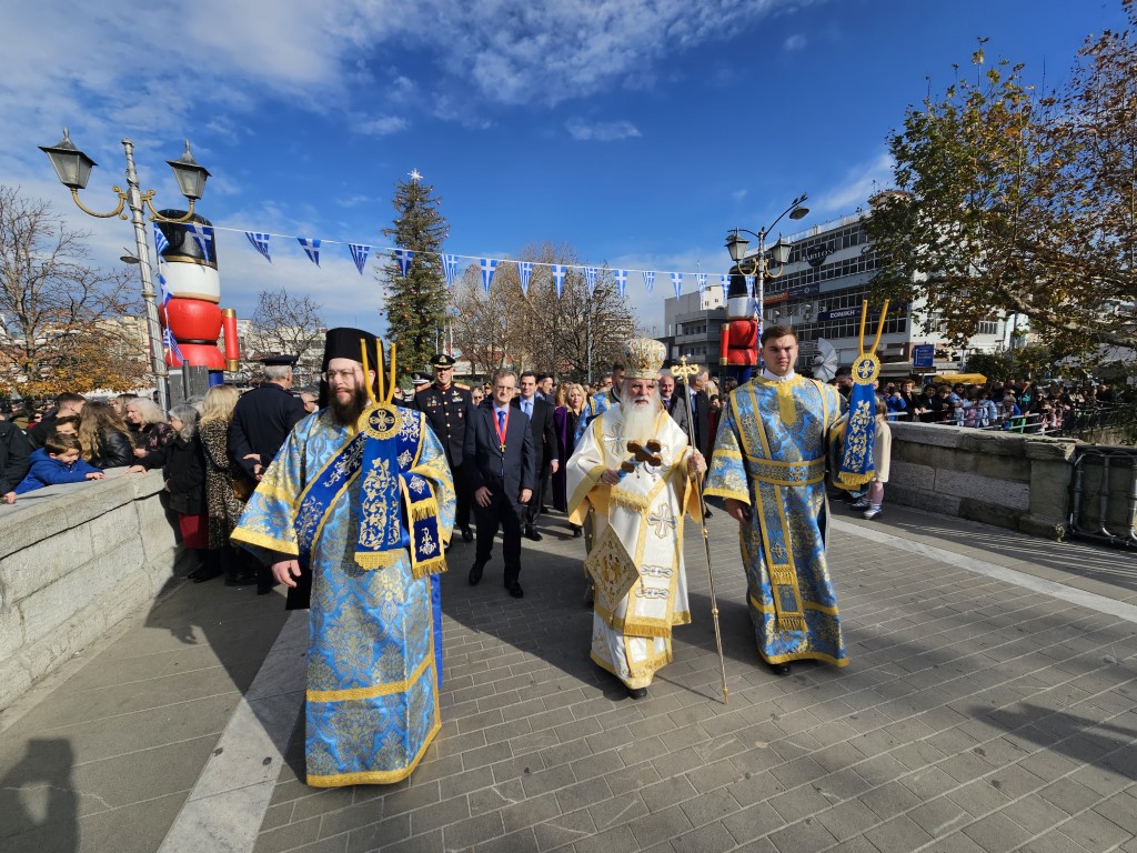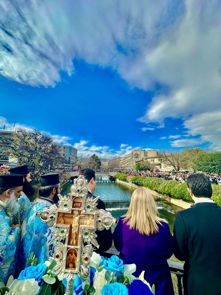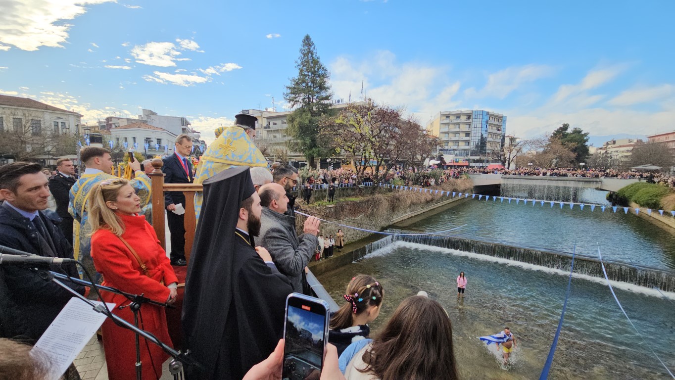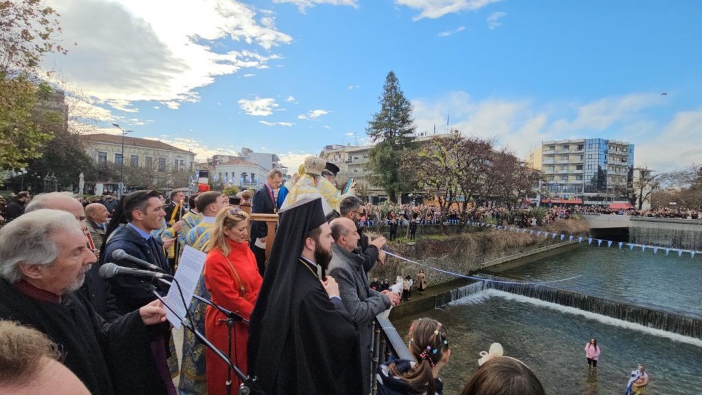 Οι δυο Αρχιερείς τέλεσαν την Ακολουθία του Μεγάλου Αγιασμού εντός του Ιερού Ναού, ενώ αμέσως μετά κατευθύνθηκε προς την κεντρική πεζογέφυρα για τον Αγιασμό των Υδάτων του Ληθαίου ποταμού. Βρέθηκαν μάλιστα τολμηροί οι οποίοι βούτηξαν στα νερά του.