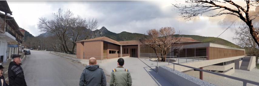 Η σύνθεση αρθρώνεται στην εθνική οδό Τρικάλων Άρτας επί της περιοχής του πυρήνα της διάταξης Γ του υφιστάμενου δημαρχείου δημιουργώντας ένα ανοιχτό υπερυψωμένο πλάτωμα από το οποίο γίνεται και η είσοδος στο συγκρότημα από την ανώτερη στάθμη.