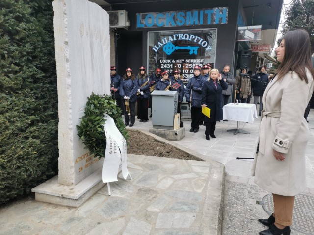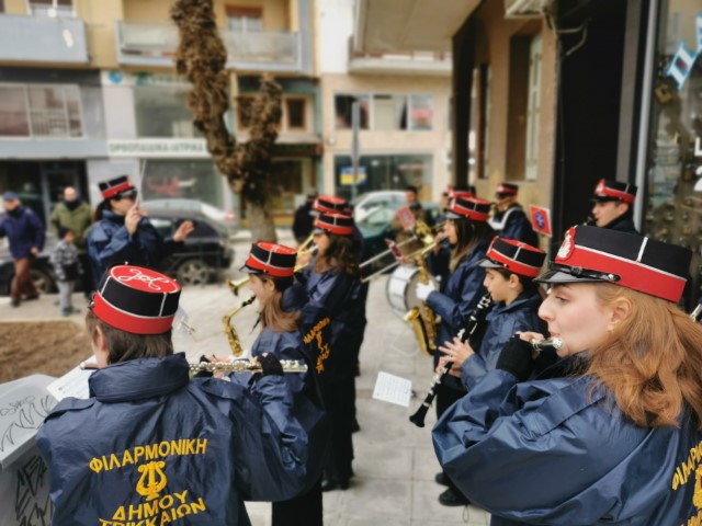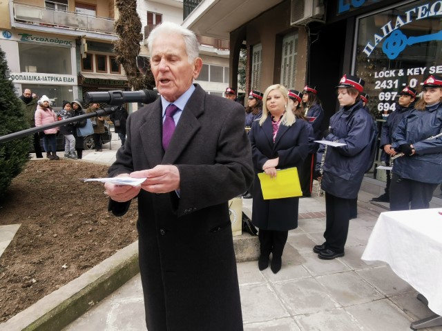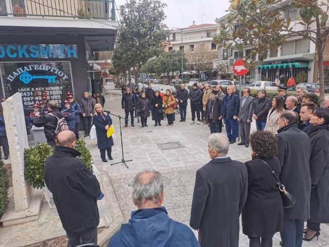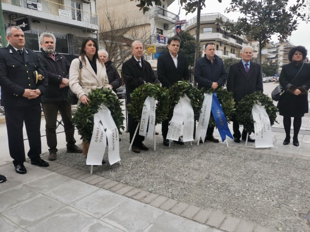 Τη σχετική ομιλία απηύθυνε ο γραμματέας του Δημοτικού Συμβουλίου Νέων Δ. Τρικκαίων κ. Γ .Κουτής, ο οποίος αναφέρθηκε, τόσο στο συνολικό κοινωνικό περιβάλλον την εποχή εκείνη, όσο και σε περιγραφές που υφίστανται για τα γεγονότα εκείνης της ημέρας. Μικρό χαιρετισμό απηύθυναν, ο ναύαρχος ε.α. κ. Νικ. Γκόγκος και ο αγρότης κ. Γ. Ρίτισιος. Ακολούθησε η κατάθεση στεφάνων: εκ μέρους του Δήμου Τρικκαίων η αντιδήμαρχος Σοφία Αλεστά, εκ μέρους της ΠΕ Τρικάλων ο αντιπεριφερειάρχης Χρ. Γακόπουλος, εκ μέρους του ΣΥΡΙΖΑ ο βουλευτής Σάκης Παπαδόπουλος, εκ μέρους της ΝΕ Τρικάλων του ΠΑΣΟΚ ο δημοτικός σύμβουλος Στέφανος Βαβύλης, εκ μέρους του Επιμελητηρίου Τρικάλων ο αντιπρόεδρος Χρ. Ζαραμπούκας, εκ μέρους της Πρωτοβουλίας για την Αγροτικής και Λαϊκή Εξέγερσης ο κ. Γκόγκος και αντιπροσωπεία του Δημοτικού Συμβουλίου Νέων Δ. Τρικκαίων. Η Φιλαρμονική Δήμου Τρικκαίων παιάνισε τον Εθνικό Υμνο, ενώ παρέστησαν ακόμη, ο αντιδήμαρχος Δ. Τρικκαίων Τ. Παζαΐτης, η εντεταλμένη σύμβουλος Δημοσίων Σχέσεων Εφη Λεβέντη, ο επικεφαλής της μείζονος αντιπολίτευσης στον Δήμο Τρικκαίων Κ. Κρεμμύδας εκπρόσωπος της Π.Υ. Τρικάλων και πολλοί/ες τρικαλινοί/ες.