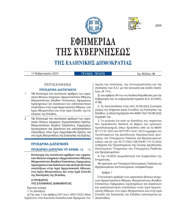 Δημοσιεύθηκε στην Εφημερίδα της Κυβερνήσεως το Προεδρικό Διάταγμα που ρυθμίζει τις οργανικές θέσεις των κληρικών της Εκκλησίας της Ελλάδος και της Εκκλησίας της Κρήτης.